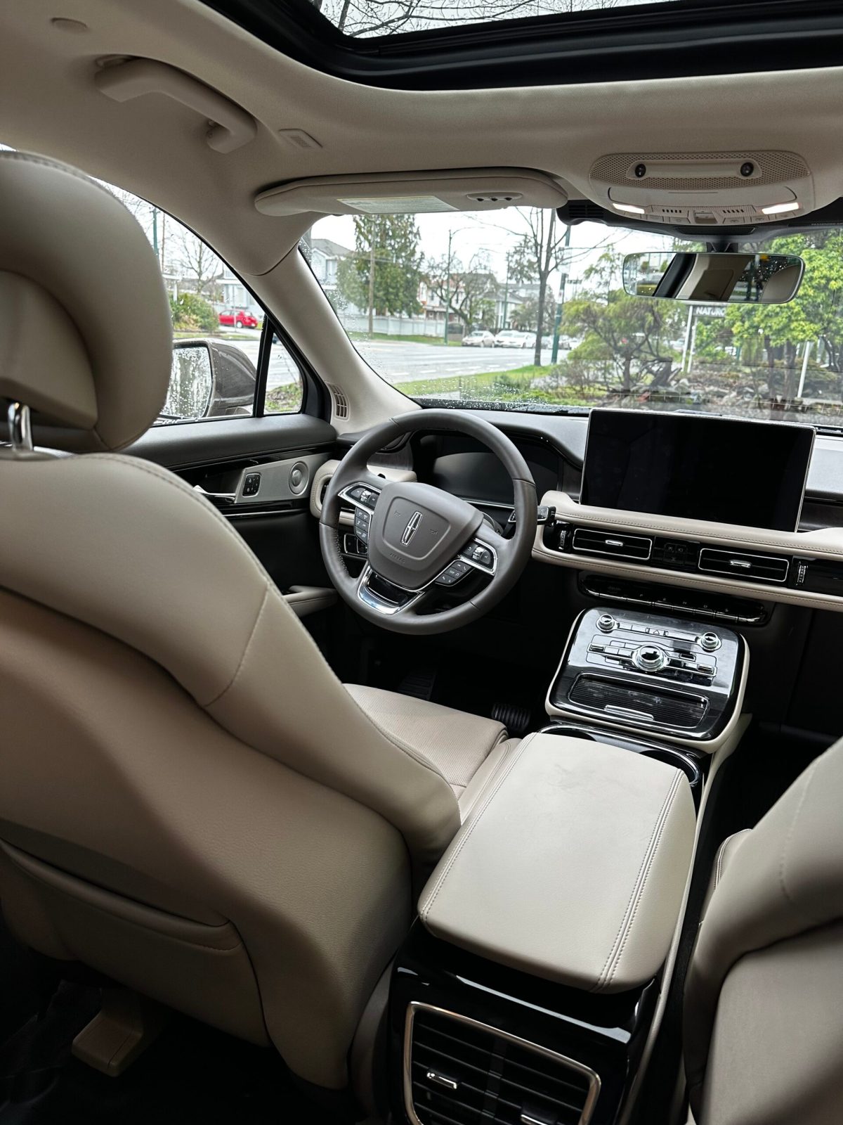 Within, the Lincoln Nautilus Reserve was spacious with smooth leather and a wood grain finish. The same leather also makes an appearance on the wheel, giving the driver a supple grip. The seats felt like they were set at a higher elevation for a better vantage point. And thankfully fairly sturdy, given how much of the road I would feel during my commute.