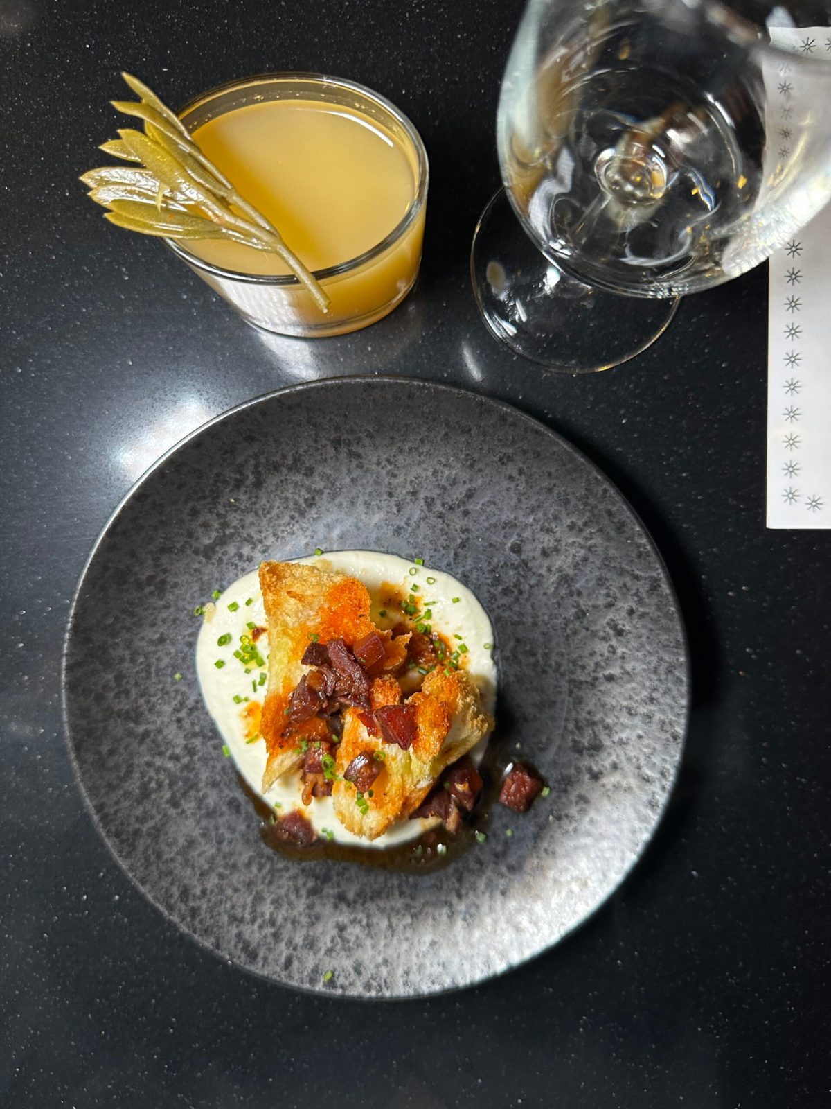 The next cocktail was Beyond the Pines: basbas, pine nut, olive, juniper, and lemon. This was a rift on a sour that spoke to the trees of the island. And in-line with that vision this was described as being herbaceous and vegetal, although I got more dessert. Sharp lemon like in a meringue pie merged with the mouthfeel of a calpis yogurt. This I found complimentary to the Mediterranean flavours of our second course.