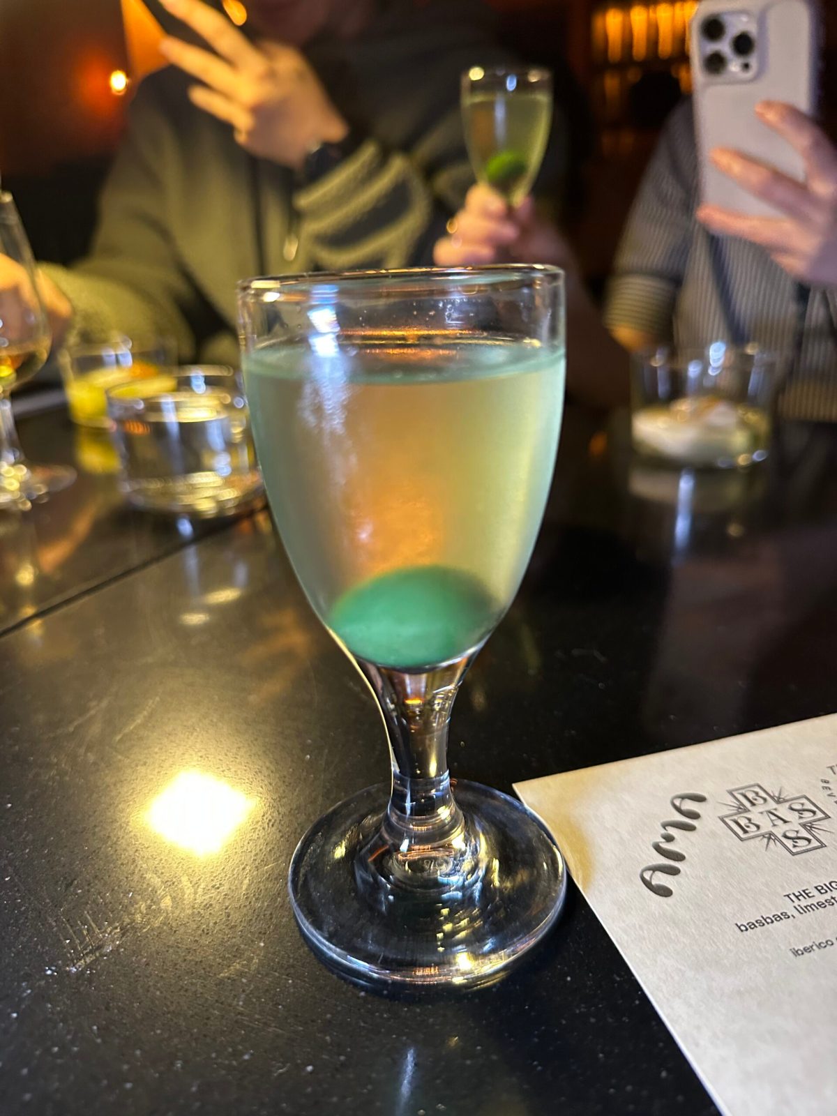 I found our final course more herbal and vegetal in representing the sea. Eden’s Tide with basbas, coastal gin, algae, and ‘garum’ (which is a style of fermented fish sauce). As an island, Ibiza is surrounded by the ocean and this cocktail well demonstrated that with its briney dirty martini quality and the aquamarine colour from the olive through the liquid. This was a savoury drink that really leaned into the characteristics of the basbas. The table agreed that this was the most complimentary pairing with the cocktail adding sea salt to season the dish.