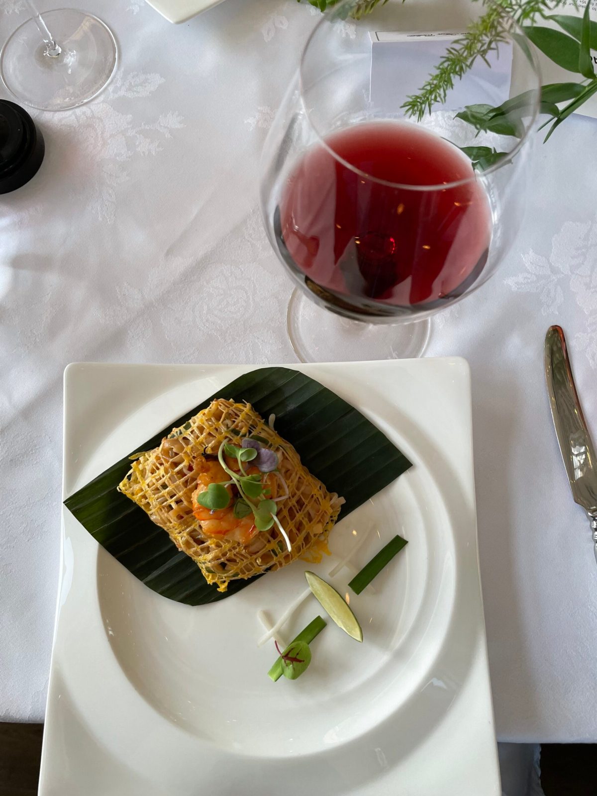 One of a kind place settings on white linens, and a heartfelt welcome introduction from Chef Nutcha greeted each individual, at their assigned seat. And as the first glass of wine was poured, our table noticed the detailing in the glassware as well. It was revealed by Baan Lao’s General Manager and Chef Nutcha’s business partner and husband, that all their glassware is custom designed, and engineered by 3 different glass artists. One does the glass’s goblet, one does the stem, and the third works on the base. Then they are pulled together for one of the finest pieces I have handled. Light weight and elegant to the touch. A great sensory feel that had be reassessing my current favourite Reidel Magnum Overture glass.