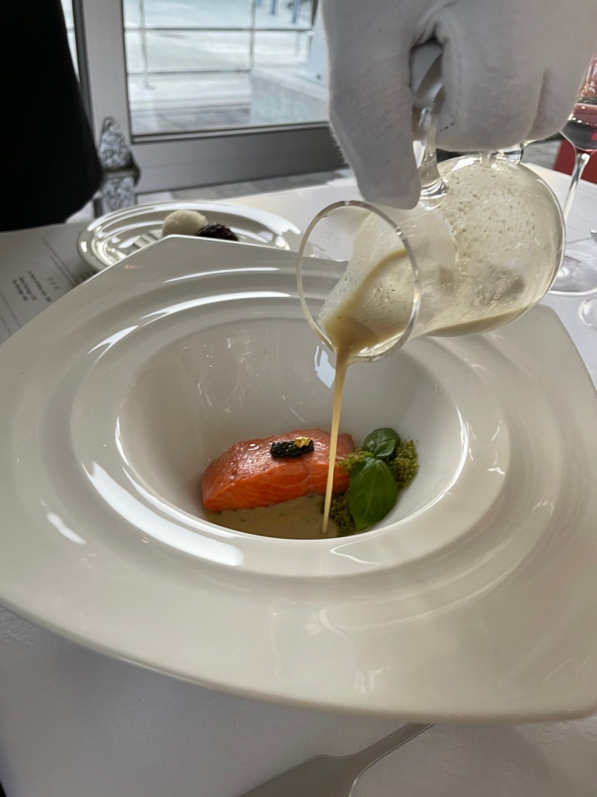 Adorned with Ocean Wise Acadian green caviar and 23k Italian gold leaf. It is presented cloche-ed, then revealed in unison for the most impact. Just before having a vial of green curry sauce poured over it, table side.