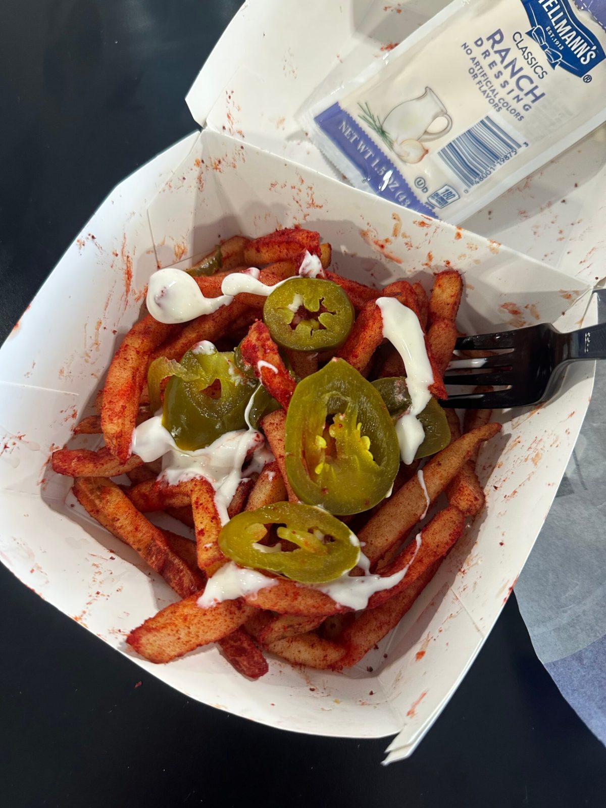 Named Skar fries, after the character they have a fiery red dusting to them and are incredibly salty as is. My take out bag included a packet of Hellman’s ranch dressing and a sauce container of jalapeño slices, so I figured they were meant for that. After dressing the fries like nachos it did make things slightly better. Still salty, but now they were also soggy fries. The ranch helped to temper with its tang, and as I am a fan of the dressing so this actually helped me to eat more. Similarly, the spicy jalapeño aided in creating more interest in the serving. Although overall, these were not a great fries, and I would not order them again.