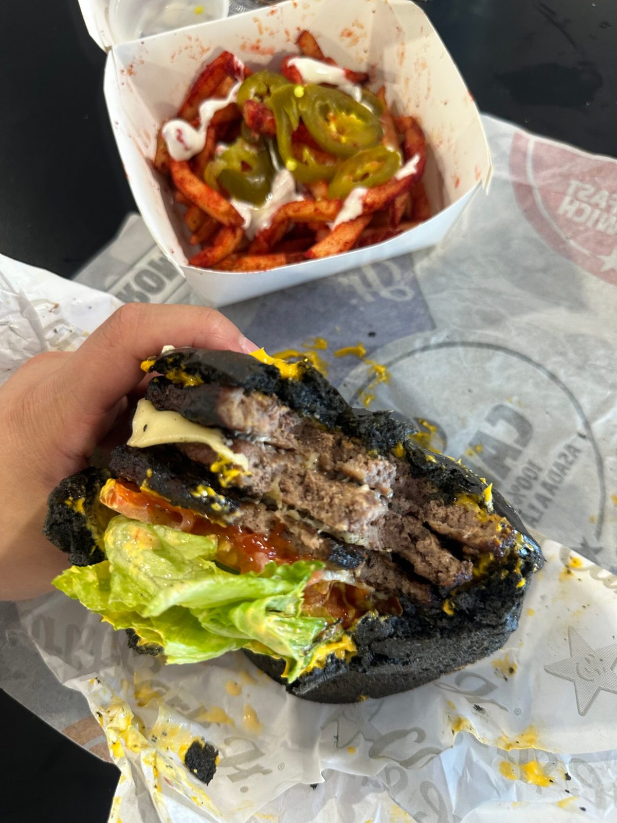 In celebration of the movie Godzilla x Kong: The New Empire coming to Latin America, they have 3 limited edition menu items. Two burgers and a speciality fries. As expected there is a lot of beef in each of the burgers. The one representing Godzilla is all meat, the one for Kong has a unique colour to the bun and a bit more vegetable because Kong is vegetarian? And the fries are for the new antagonist.