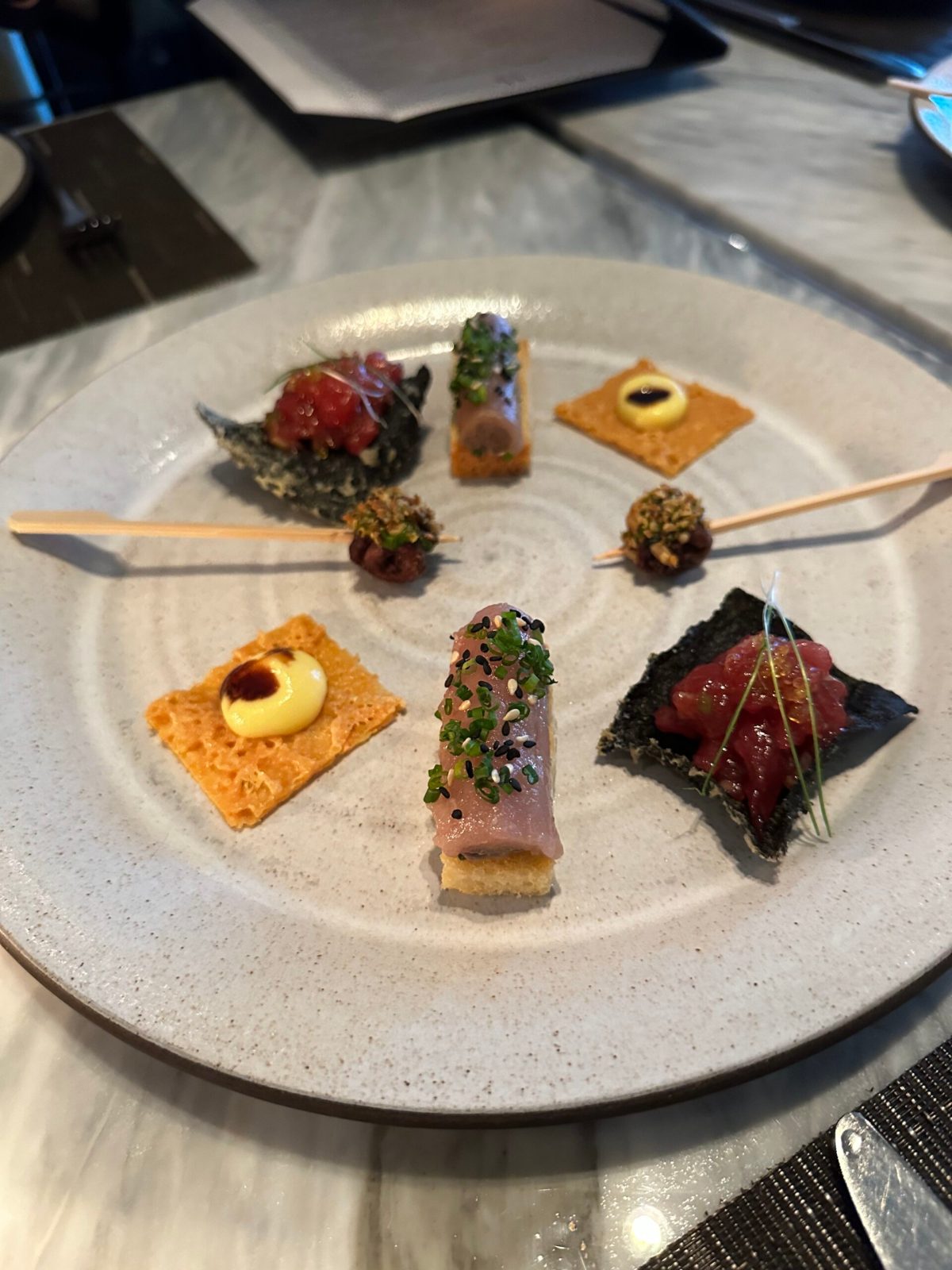 The first course will be labelled “snacks” and featured a bite from each of our aforementioned chefs. This was a great introduction to each, and you could clearly see their personality and influences presented on this plate. (More on each, as we explore their course.)