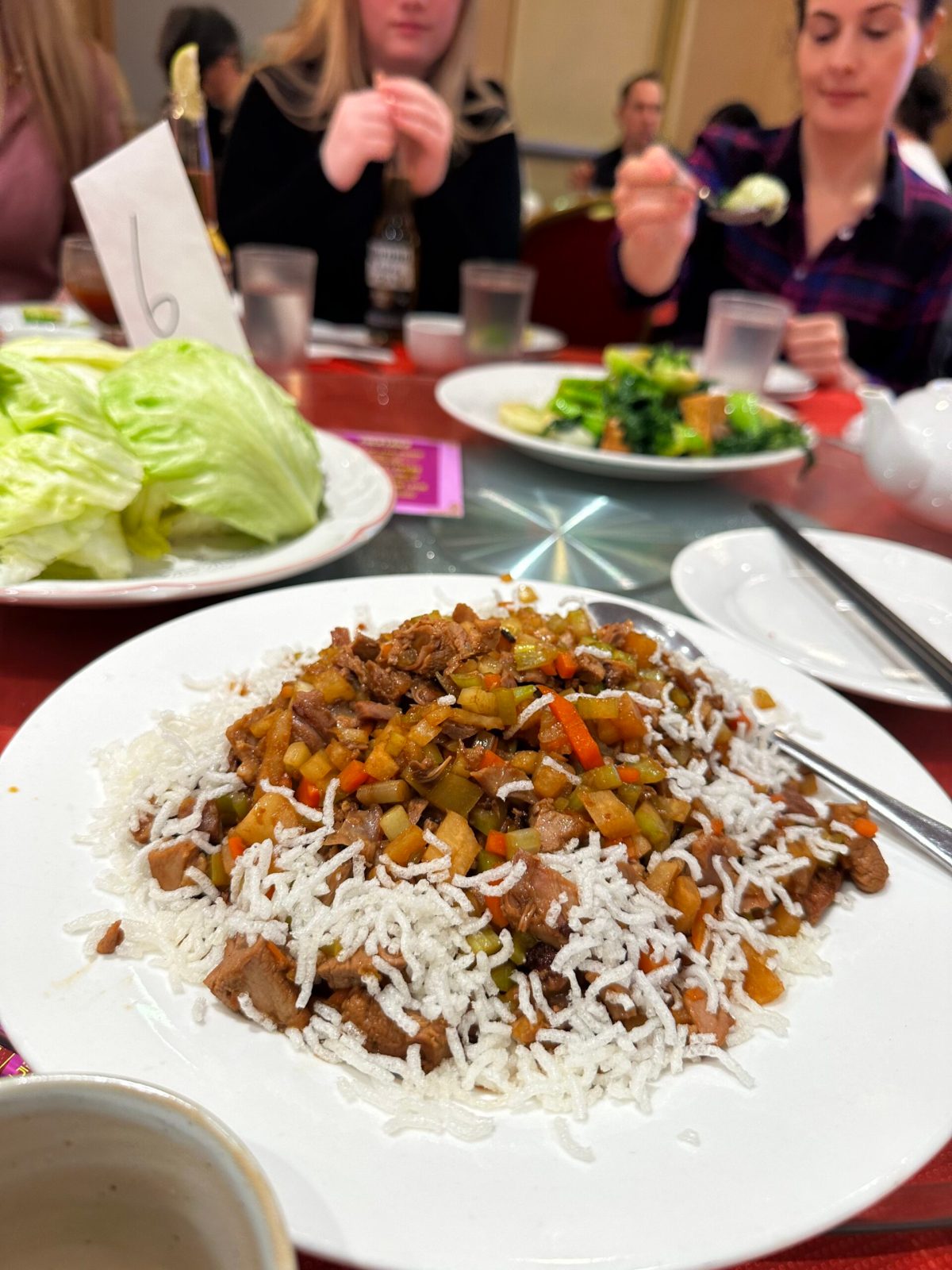 Everyone was too forward at our table, so our server dispensed the Peking duck for us. She scooped a pancake and two pieces of duck breast for each person. Followed by the preparation or additional bites for those bold enough to claim another from off of the lazy Susan. The pancakes were a little undercooked and floury. Inconsequential, considering that you are eating this for the crispy duck skin and meat, and are splattering the lot of it in a sweet and salty brown sauce anyways.