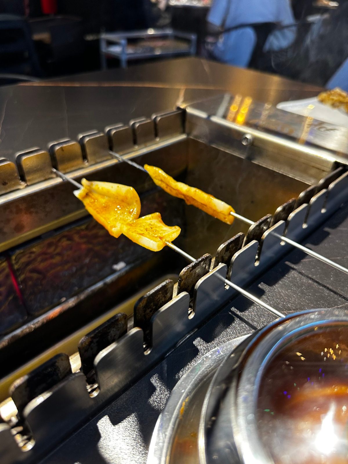 The server who drops off your order also, places each metal skewer onto the rotating rack. Each stick in its own slot over speciality designed troughs built into the table. This heats and cooks the meat from below, while catching any excess drippings.You just have to be careful to not drop anything into it, because you won’t get it back. I wonder how often and if they clean this grease trap out?