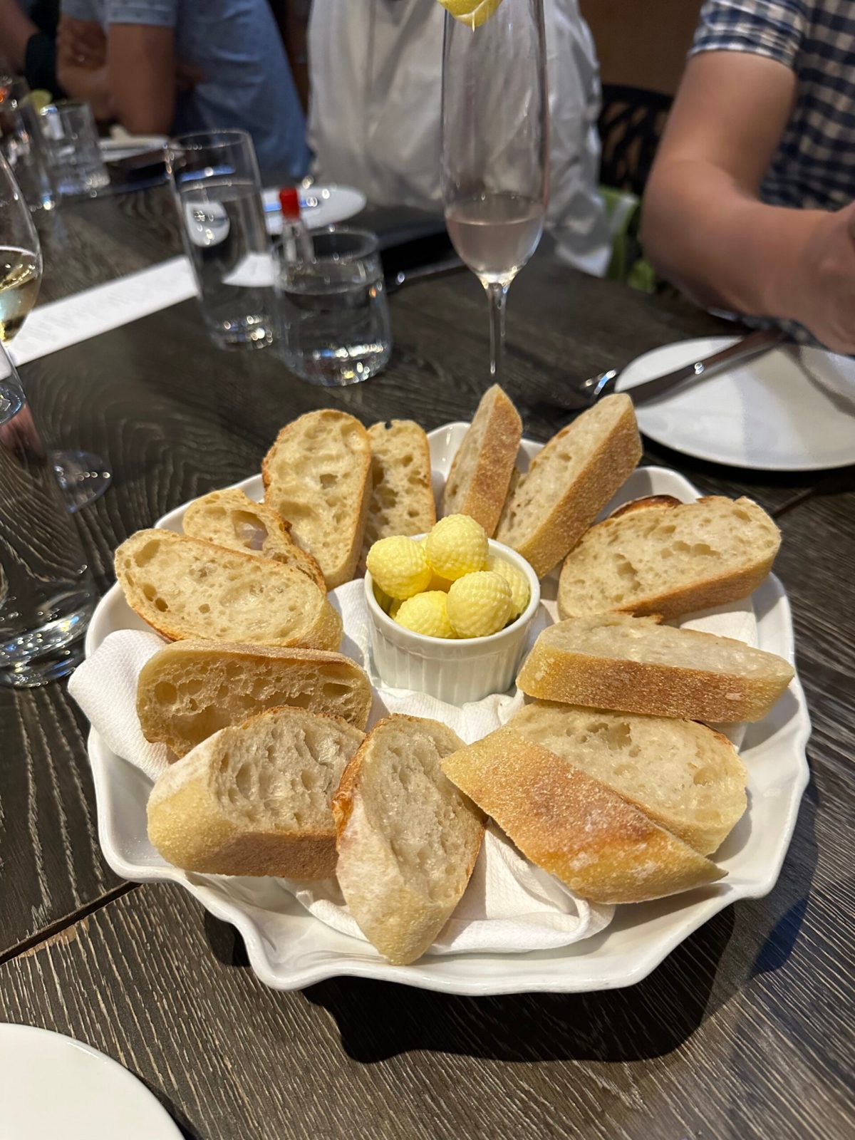 Dinner began with a Bread Service. Freshly baked baguette and butter. The standard room temperature hard and tough bread with slightly chilled butter that tears the bread when you spread. Many of us opted to pass on a sliced, to be able to save our appetites for our meal to come.
