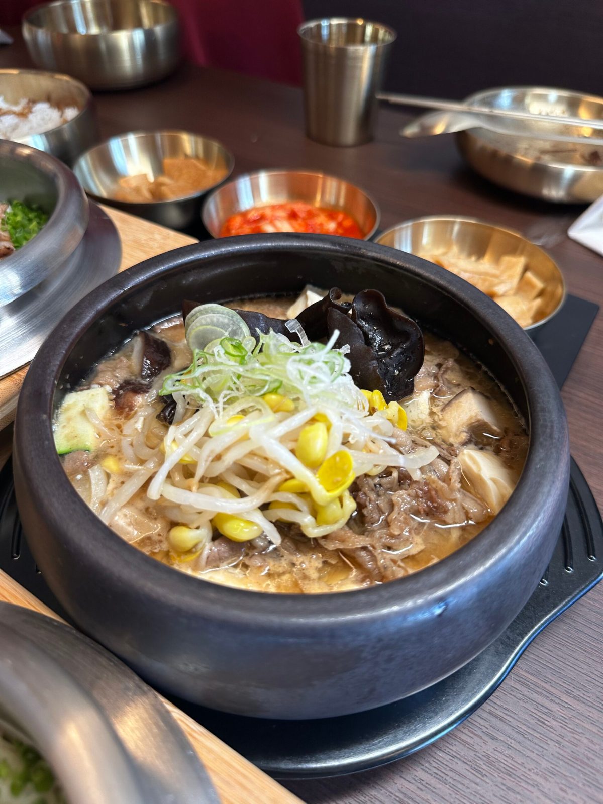 Each stew includes soft tofu, zucchini, pyogo mushrooms, seasoned bean sprouts, wood ear mushrooms, scallions, and sesame oil. You have a choice between spicy or non-spicy. Either the Soybean beef broth in a murky eggshell white or the Keumsan’s spicy beef broth in a neon red. From here your choice is the main ingredient that your stew will be centred around.