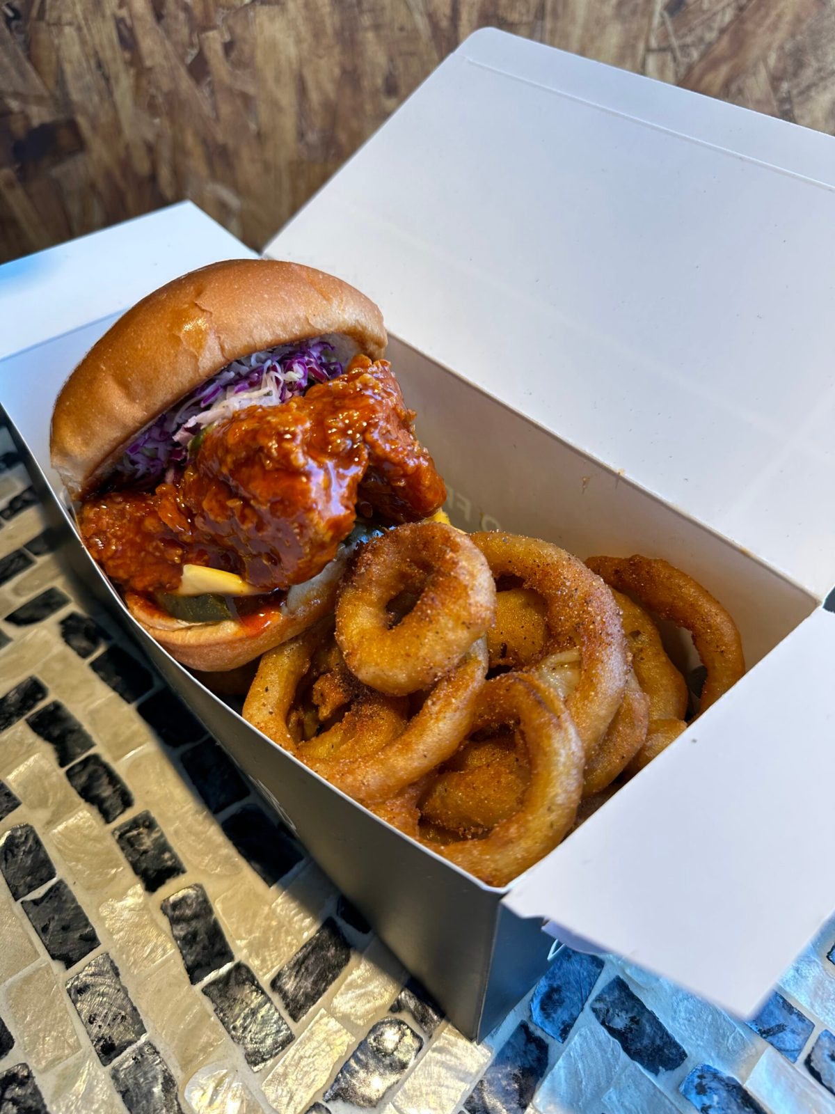 We also tried their chicken sandwich with sweet and spicy chicken. This was a 3:1 ratio of chicken to bun. The large piece of chicken breast stuck out from in between the burger buns, and you needed to unhinge your jaw to get a bite in. Heavily coated in the sweet and tangy sauce, it was not overly spicy, with much of the heat being tempered by the cheese, raw shredded slaw, and pickles. And once again the chicken was fried, but ate lean. It was not greasy, as told by the lack of grease in the air. I felt healthy eating their fried chicken, so was sure to finish the burger and all the onion rings. Their food had be feeling calories don’t matter here.