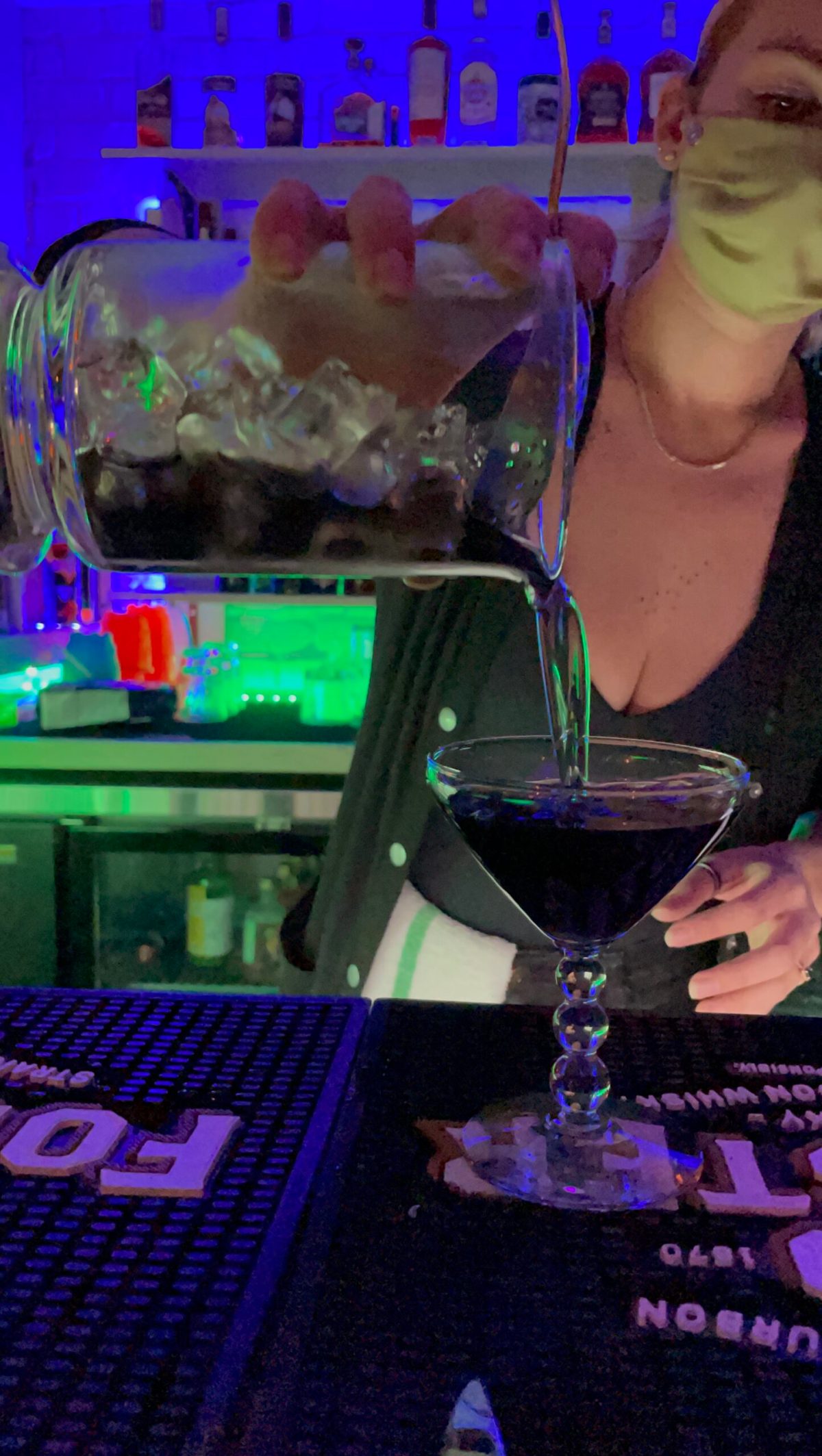 The Soot Gremlin is a black cocktail, as expected. Made with actual activated charcoal, Suntory-Stoli Whiskey, Luxardo Maraschino, Tawny Port, charcoal syrup, and back walnut bitters.