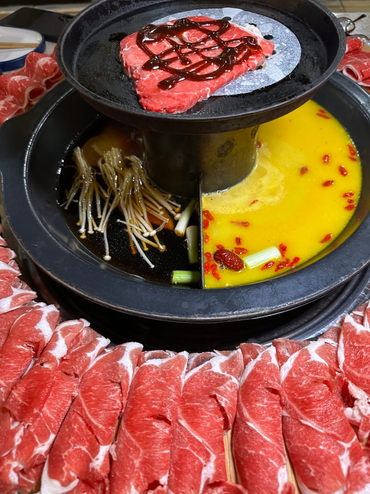 They are currently the only ones offering a tiered hot pot experience, where you can boil your hot pot while barbecuing meat on a grill just above it. Two ways to eat all you can.