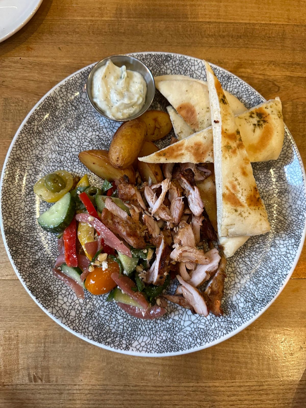 Available in either chicken or lamb the Shawarma plate comes with the Greek salad and tzatziki mentioned above, lemon potatoes, and pita. With all the other dishes before and after, this one seemed lacklustre. There is less of an emphasis on presentation here, having the chicken chopped up and looking sloppy. It all tasted good, but you wouldn’t necessarily feel like you got your moneys worth. This is what you would expect from the food court, visually. Instead, I would include rice have the salad chopped chunky, and serve the chicken and pita as a whole; for a more fulsome plate, and something more in line with an entrée that you would expect from a Greek restaurant.