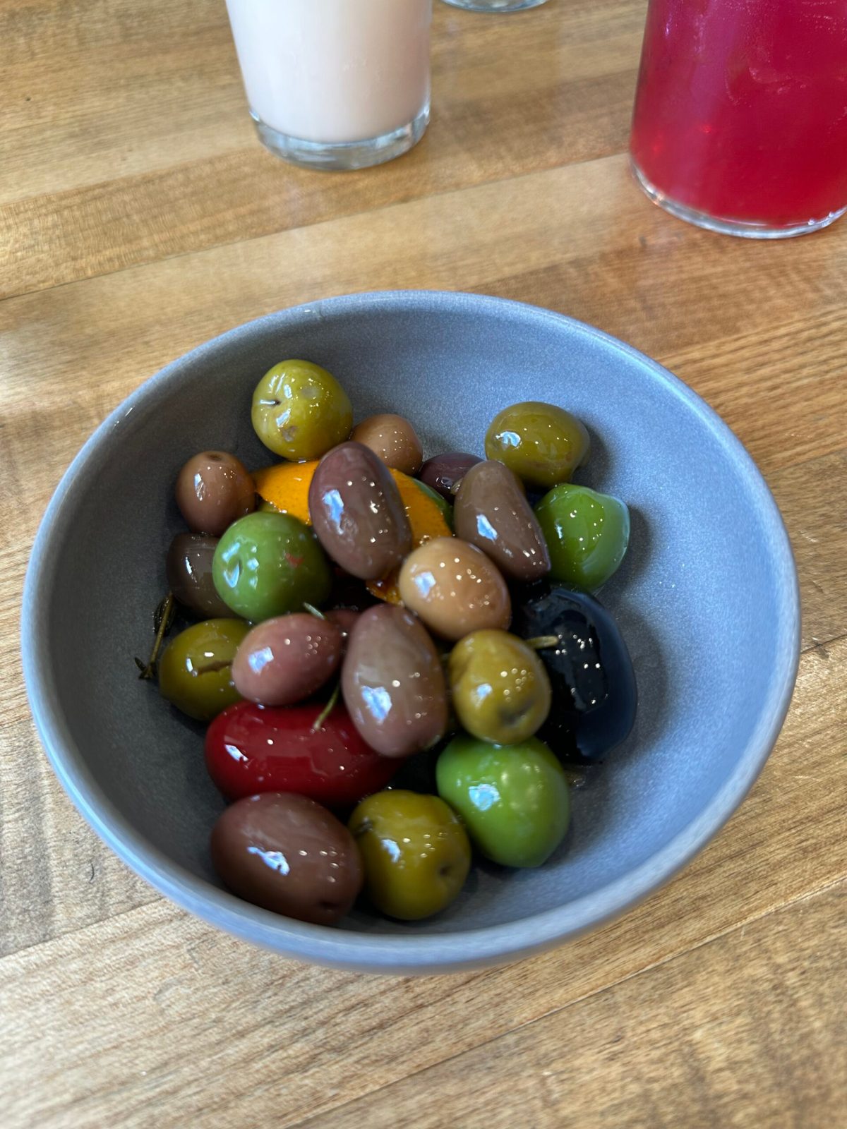 As for food, to start with our table shared a bowl of warm olives. An assortment of colours and types marinaded in olive oil, garlic, chili, rosemary, thyme, and citrus. The black olives were soft and mild on the brine. The red ones were hard and salty. And the large green ones were my favourite, being the middle ground for firmness and being not as briny.