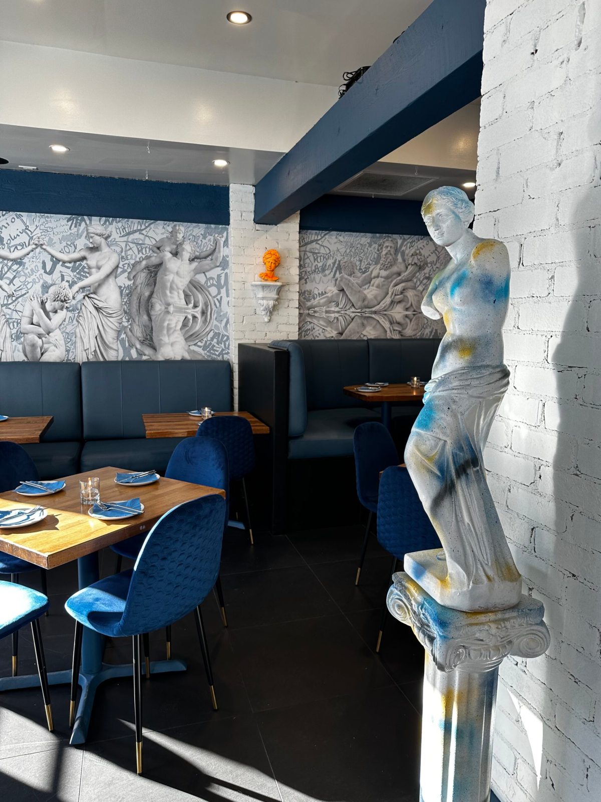 The location is hard to miss, as the restaurant is fully dressed in the traditional blue and whites of the Greek flag. Not to mention the Grecian statues that grace the exterior entrance, as if on guard. Each figure spray painted in a kaleidoscope of neon colours. Classical art meets pop art, old meets new; once again, following on the same vein as their menu.