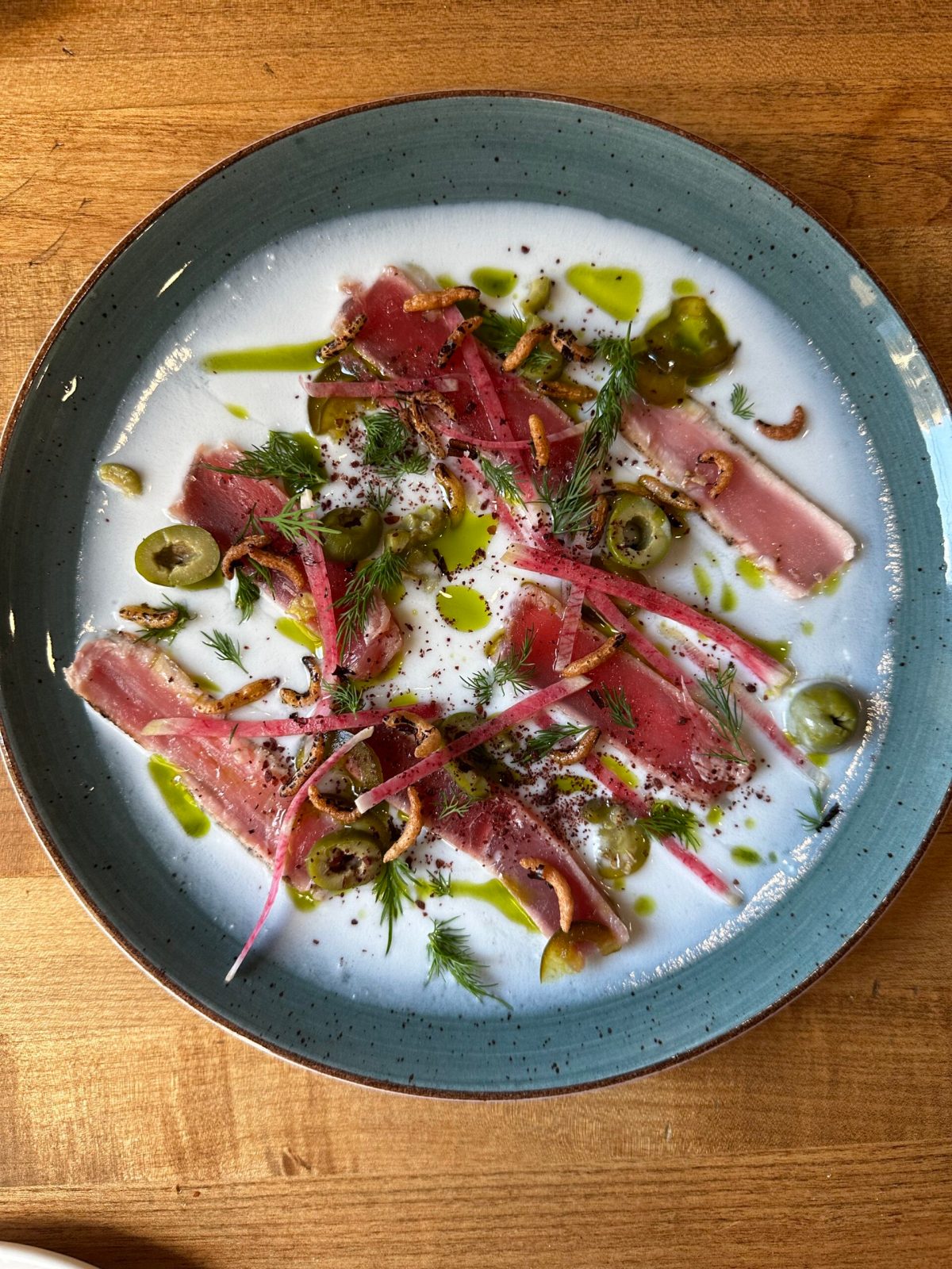 The prettiest plate of the night goes to the Tuna Carpaccio. Seared rare ahi tuna with a Greek yoghurt vinaigrette. Topped with dill oil, fresh dill, pickled jalapeño, puffed wild rice, smoked castelvetrano olives, sumac, and watermelon radish. This isn’t like the Japanese style tuna tataki, where the fish just as raw, but presented as the star of the plate, and the seasonings are barely there. Here, the tuna carpaccio served as the base to the collection of bold flavours and unmistakeable textures. As a whole the plate was overly pickled and briny, thus making it an ideal starter to help open up the appetite.