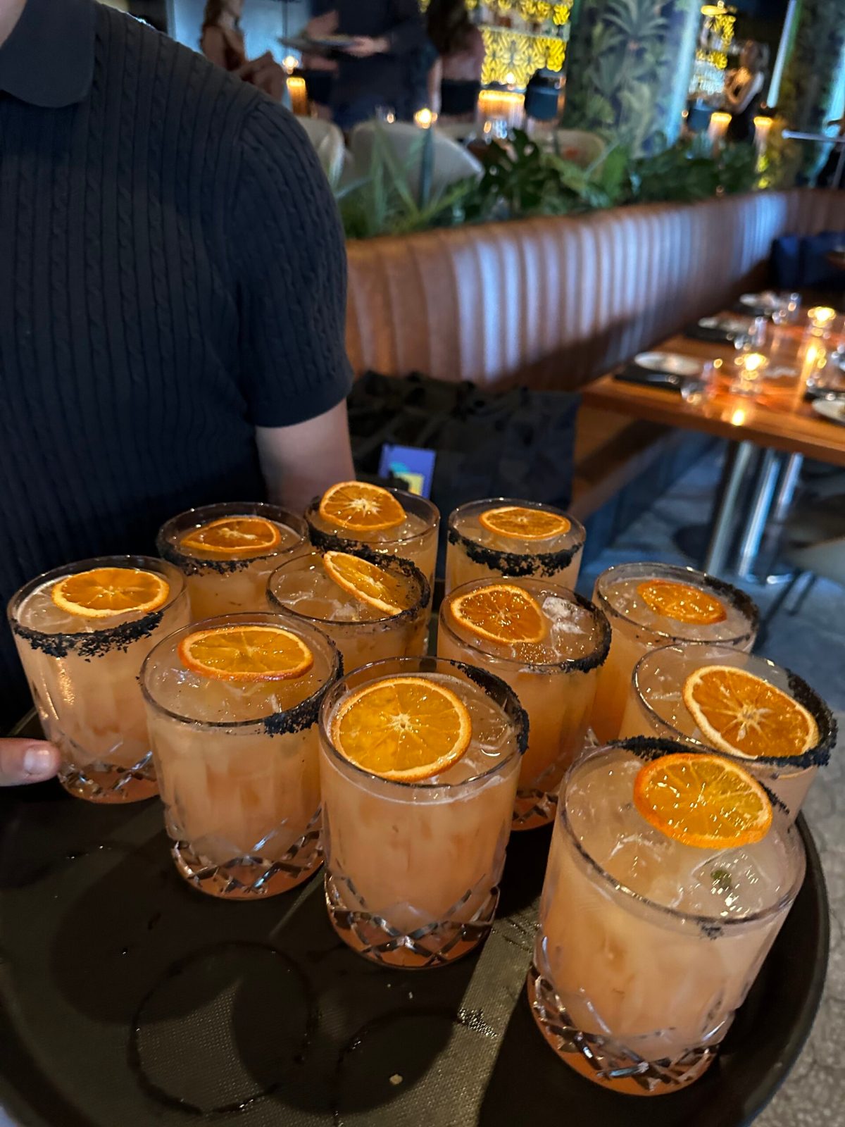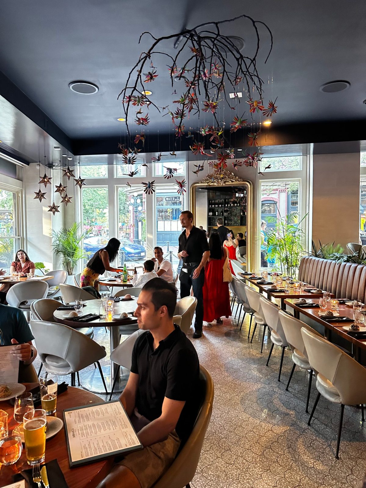 Located on one of Gastown’s prominent corners it is easy to spot and is one of the few restaurants with a patio to take advantage of. Inside, the restaurant is chic with milk chocolate brown leather seats paired with navy blue throw pillows. And given character through greenery tracing around the space and creeping up columns as wallpaper. A large mass of melted candles greets you at the door, you follow a sky of light up geometric stars to your table, and appreciate the ornate tile pattern that ran across the bar and kitchen.