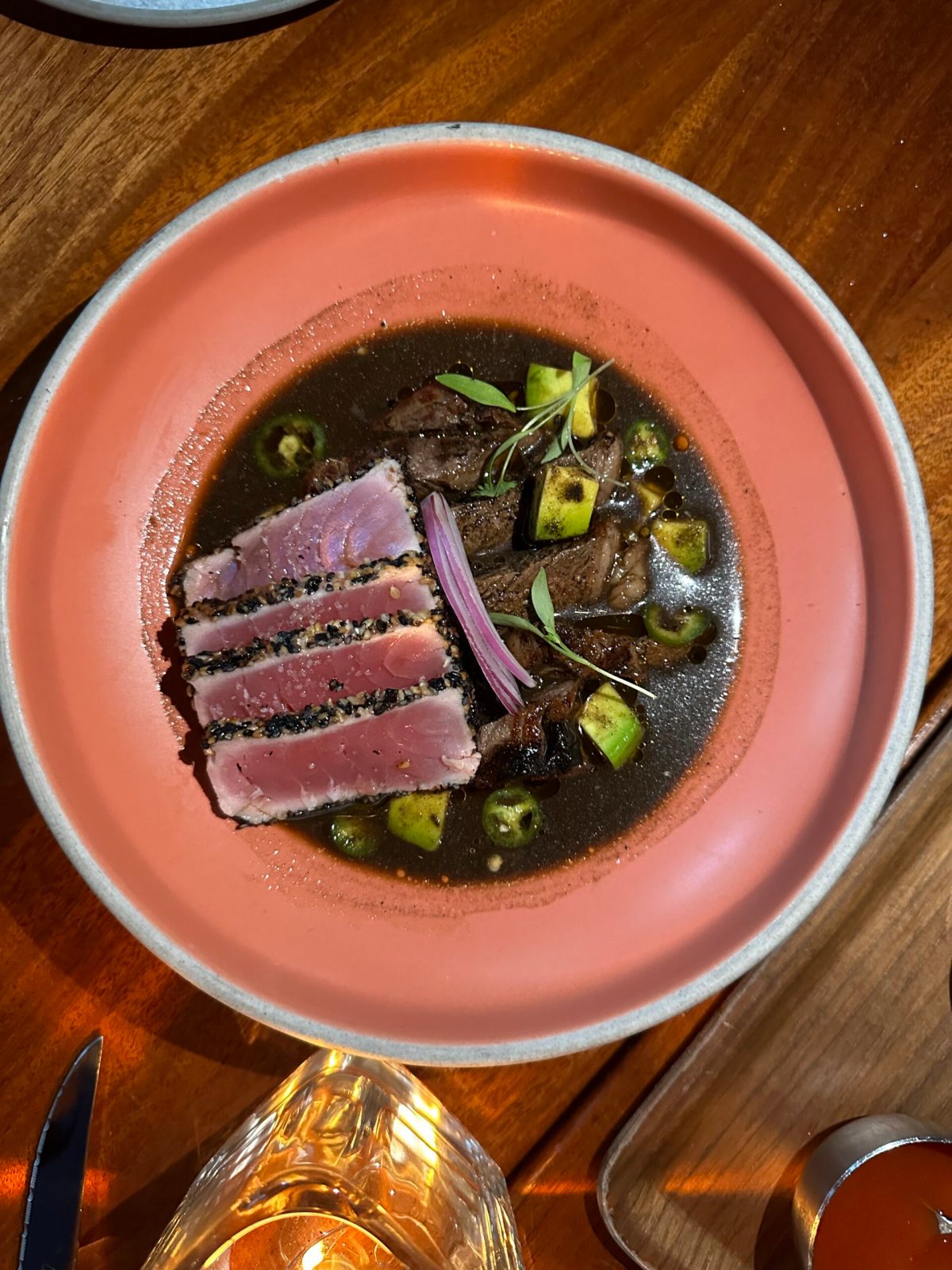 The “Aguachile de ribeye y atun” was an interesting take on surf and turf. Grilled Ribeye, Ahí Tuna Crudo, Chiltepín Lime Jus, Red Onion, Avocado, Cilantro, and Serrano Pepper. I liked the idea, but less so the execution. The fish was so lean and light, and although it sat above the broth, the sauce was so heavy that it overpowered the tuna. You wouldn’t eat the proteins in conjunction, but rather one after the other. At least the meat was tender for both and the sauce tangy and brightening with citrus for the steak.