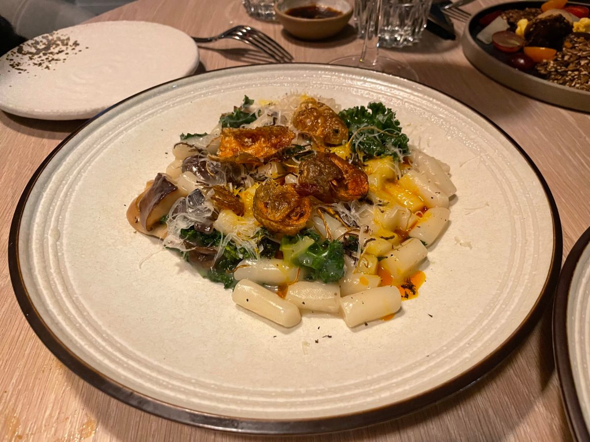 If you are only going to order one entree, the Truffle Tteokbokki gnocchi gets my vote. It is basically Korean style ride cakes prepared like gnocchi with Italian herbs. It is tossed with local wild Mushrooms and a Sunchoke puree, then garnished Parmesan cheese and Truffle. The texture is the best part. More springy and chewy than gnocchi, and it carries the seasoning well. This, I could have completed a whole serving of. And trust me, it tastes much better than it looks here.