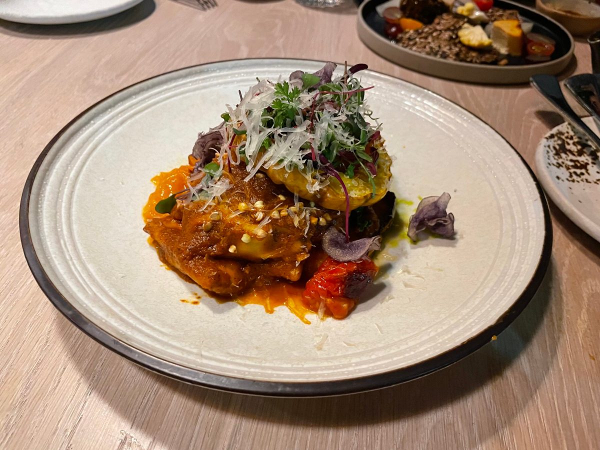 If you are looking for something more filling, the Agnolotti is a nice zesty option. (stuffed pasta made from small pieces of flattened pasta dough, folded over a filling of roasted meat or vegetables). This is Turmeric Agnolotti with Blue Heron cheeses tossed in a sauce of fermented Chili Arrabiata and confit Tomatoes. To finish it is garnished with shaved Parmesan, Peppercorn, and Toasted Kasha. It eats like a ragu, thick and spicy with hearty chunks. The only thing I wanted was some bread or naan to help smear through the sauces and lick the plate clean with. We didn’t get it here, but did with the toast option below.