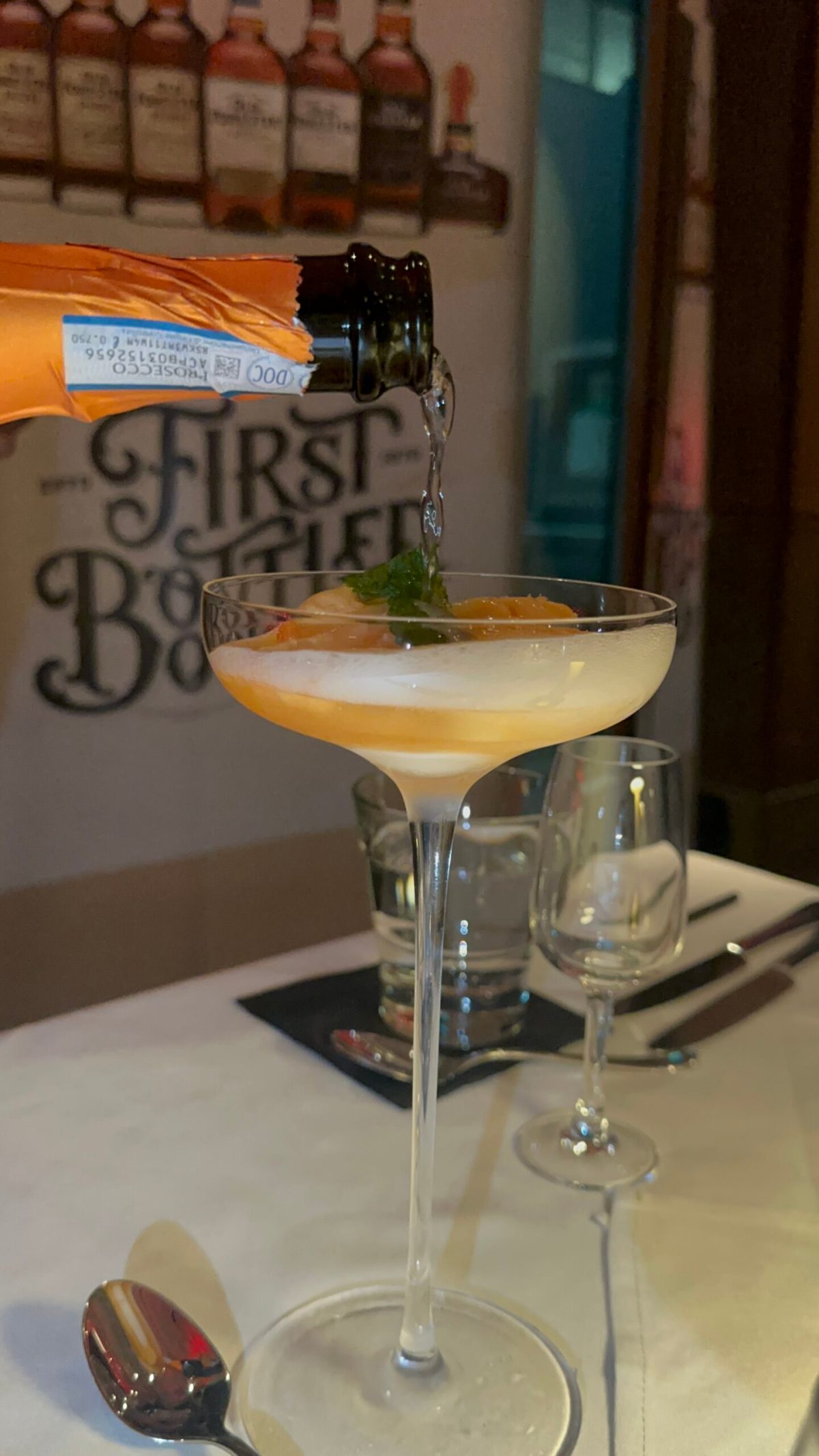 As guests were seated we started with the Kentucky Sorbet, which was more like a dessert to start. Served in a delicate, tall coupe, at mouth level, for an awe giving presentation. Lemon and Peach Sorbet, Old Forester Signature 86 Proof, Prosecco, and Lemon Zest. The Mionetto sparkling wine topper was served table side for a little theatre, and it was recommended that we allow the sorbet to melt down to best enjoy what is essentially an adult slurpee. And for those who finished, we were given top ups of the Prosecco, because you can’t cork sparkling back up.