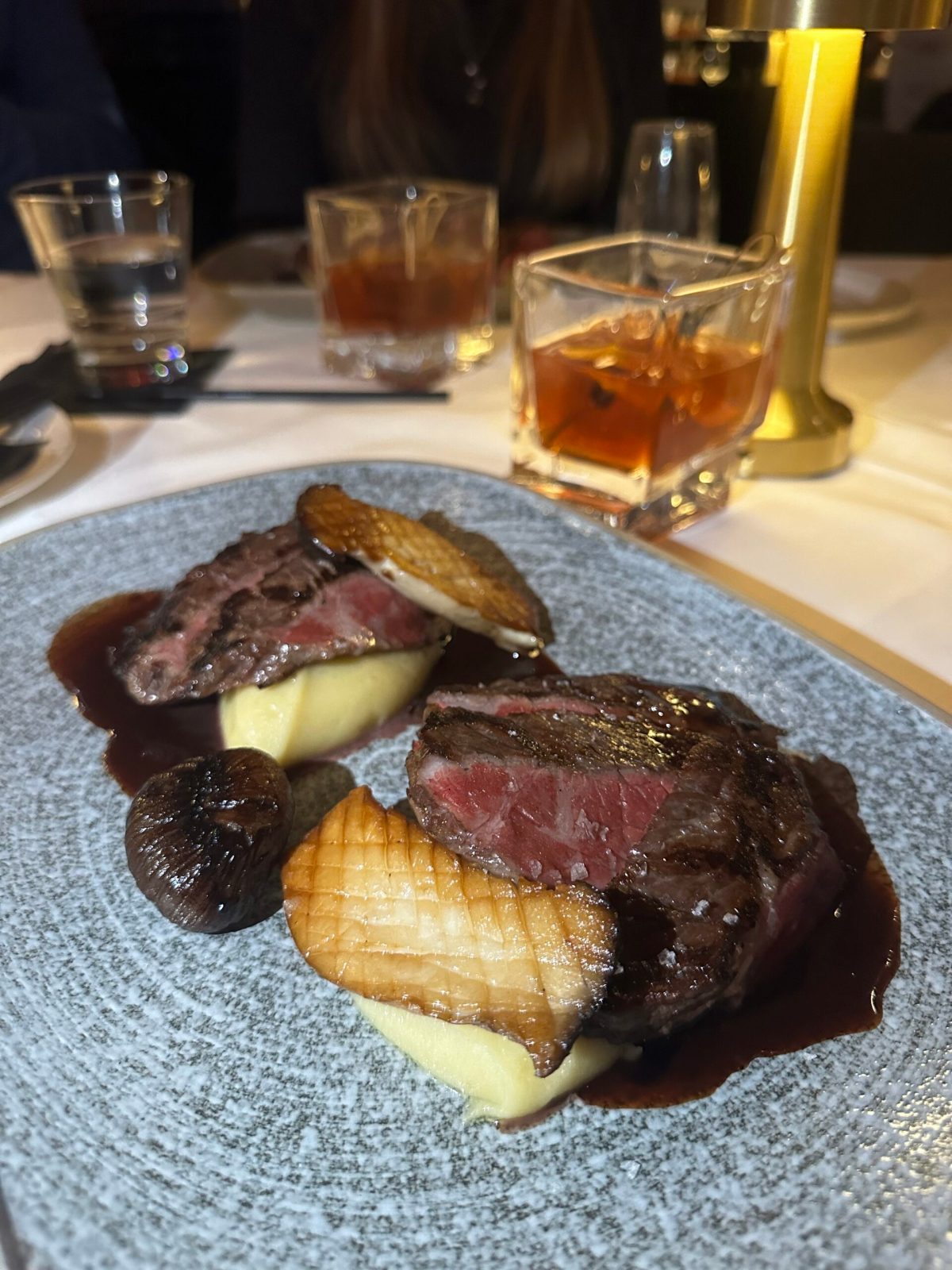 And once the smoke cleared we were all in awe of how stunning the glass was. A heavy square shaped tumbler that looked like an ice cube sliced. The bold flavour of this classic matched the heft of its vessel, and the cut of the steak. This felt like the most cohesive course of them all.