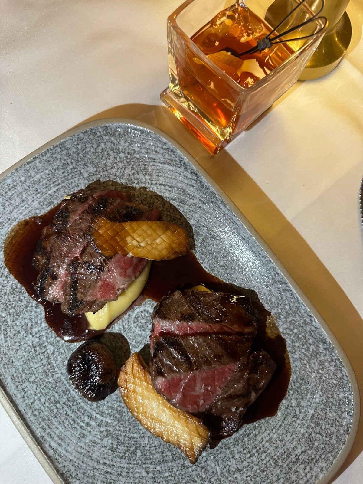Our next food course had us choosing between steak or a Mushroom Truffle Risotto, once again the table had unanimously ordered the Angus Prime Striploin. And to our delight, what came before us looked to be two servings worth of meat. 4-5 slices of perfectly pink at the centre, charred striploin over Pomme Puree with King Oyster Mushroom, a Cippolini Onion, and a Bourbon Peppercorn Jus. At this point I love how many times the kitchen featured the spirit of the night, and in each way, so different.