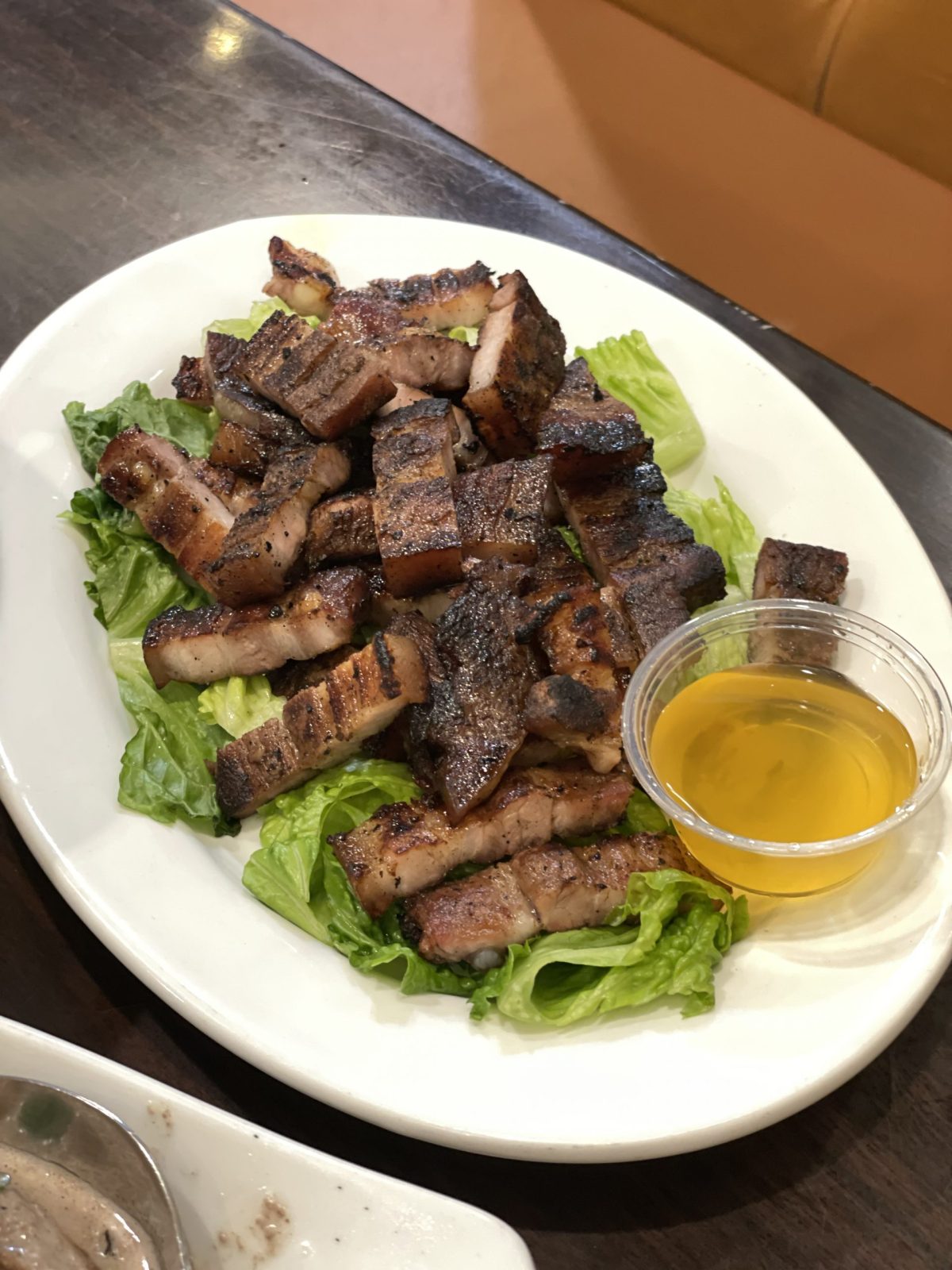 We also got the Inihaw na liempo, simply listed as “pork belly” on the menu. No flavour or preparation description. I was only confident in the order, thanks to the run off confidence from my host. It tasted premade and pan heated to order. You got the flavours of an even grill, but the meat was once again on the tough side. And once again my host thought nothing of it, so this I have concluded that this is the norm. The side of mild, only slightly tangy sauce helped to lubricate the dry meat and change the flavour, but I would have preferred a nice gravy for this instead.