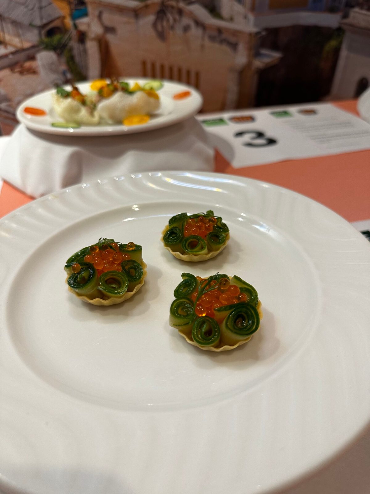Competitors no.5 gave us a beautiful and delicate cucumber tart to start. Cucumber curls expertly sliced and twirled for an eye-catching presentation. This is definitely something I would pick up from a rotating tray of canapés. However, they forgot that this was a tunafish competition. There was no mention of the tuna in taste or texture. The fact that cucumber was the dominating flavour and masking the fish meant that there is not a lot of it to begin with. Similarly the fish roe stole the show, if you are trying to highlight tuna fish, the roe only takes away its attention.
