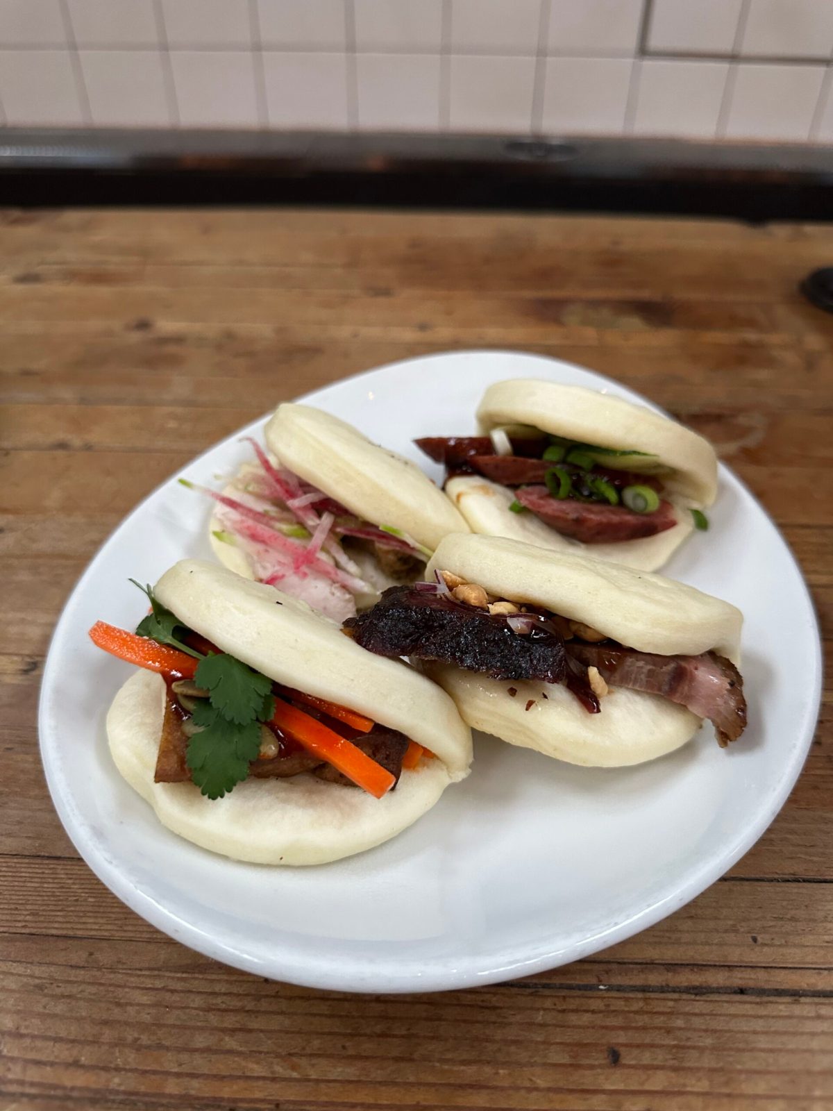 They have four different types of barbecue baos, meat or tofu in a white dough bun with vegetables. Three buns to an order. I got one of each as a sampler.