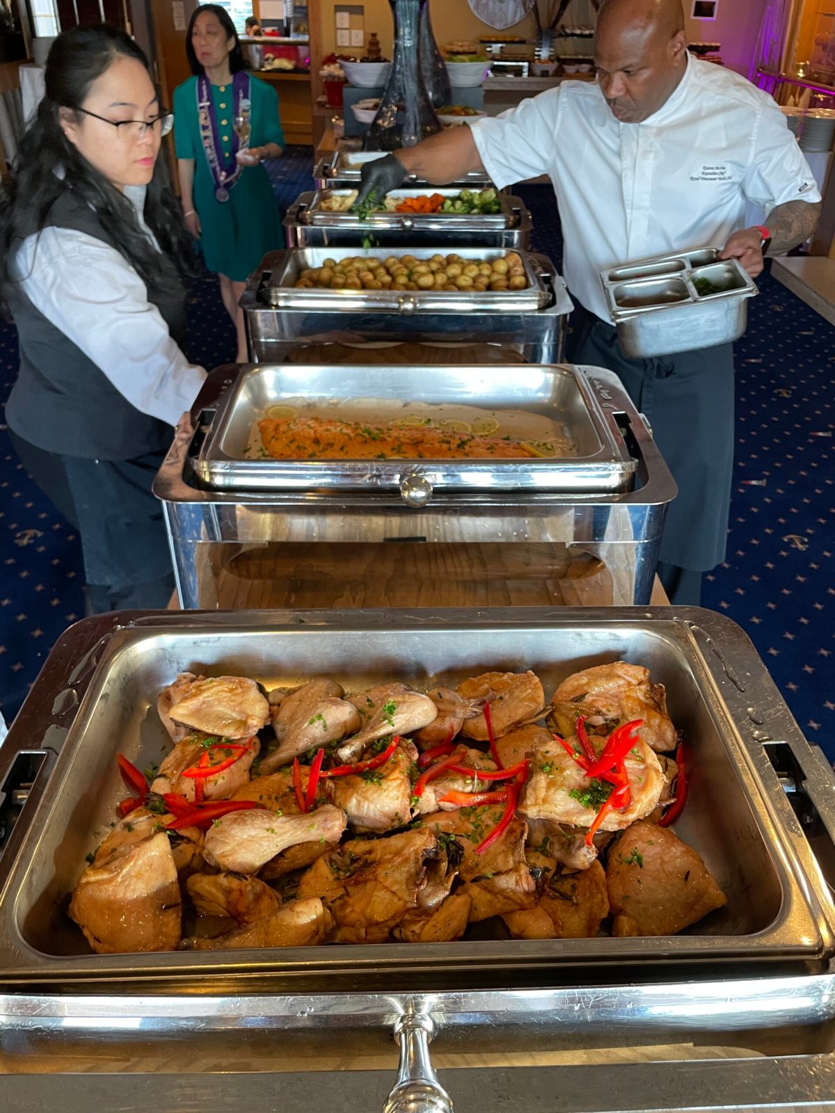 The hot buffet line included soup and salad options and troths of roasted vegetables, baked salmon, and chicken.