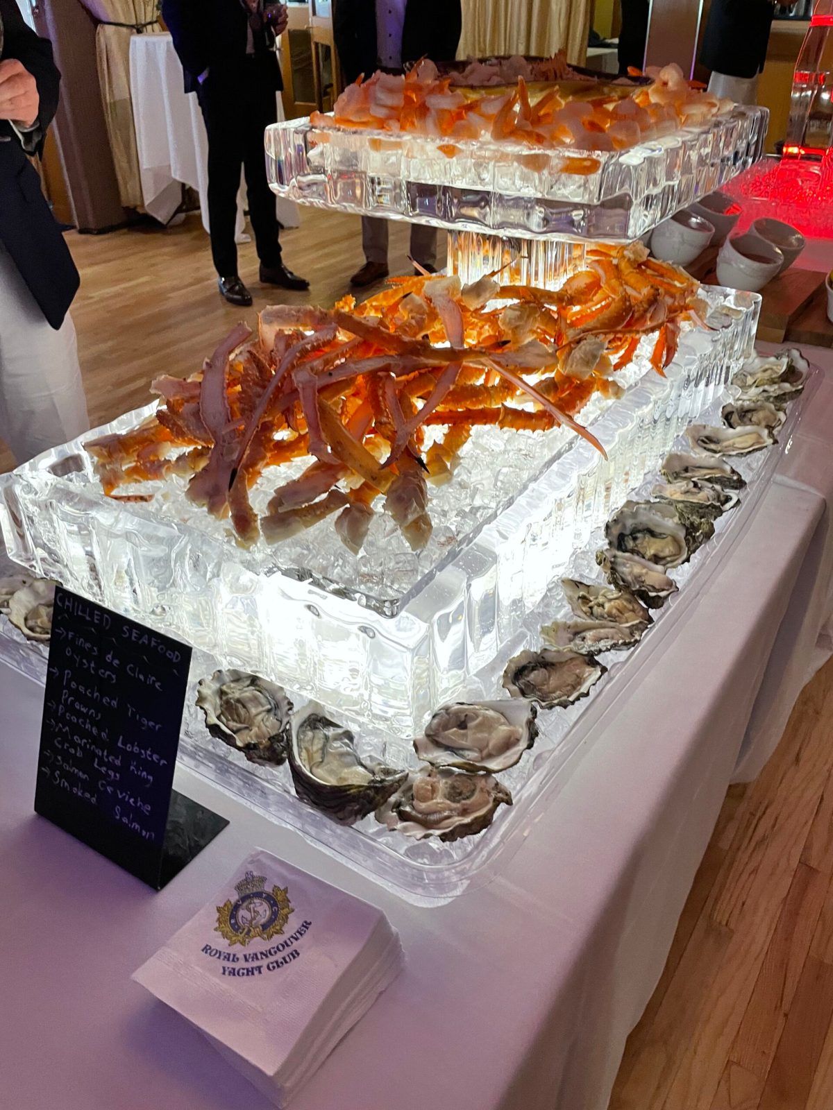 Like the ice tower with themed ice sculpture. The former was a tower of three layers, showcasing raw oysters in a half shell, half cracked snow crab legs, peel prawns, and de-shelled lobster tails. Followed by all the possible accompaniment of condiments and smoked and raw salmon.