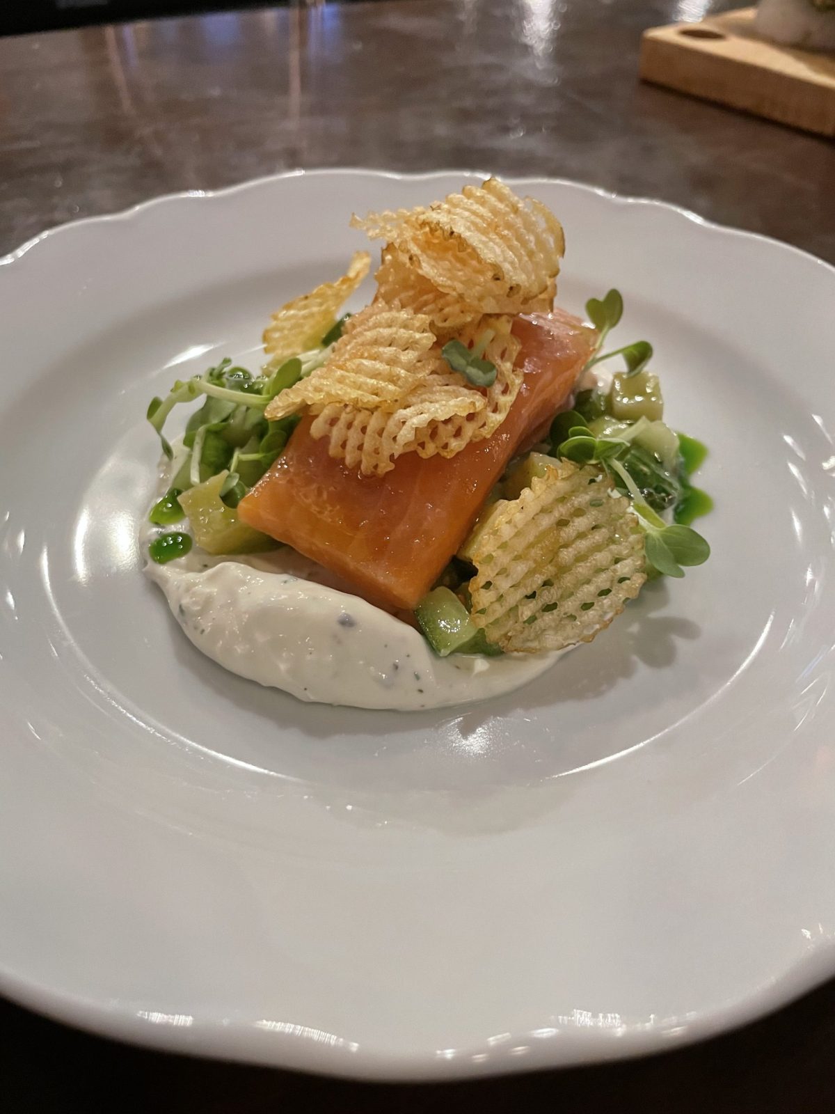 As for our set starters, this was their Lightly smoked trout, fresh cheese with herbs, cucumber and potatoes. The fish was described as being within the same family as salmon and it ate like it. The dish as a whole read like an elevated salmon and lox with the familiar combination of tartar-like cream, and fresh vegetable.