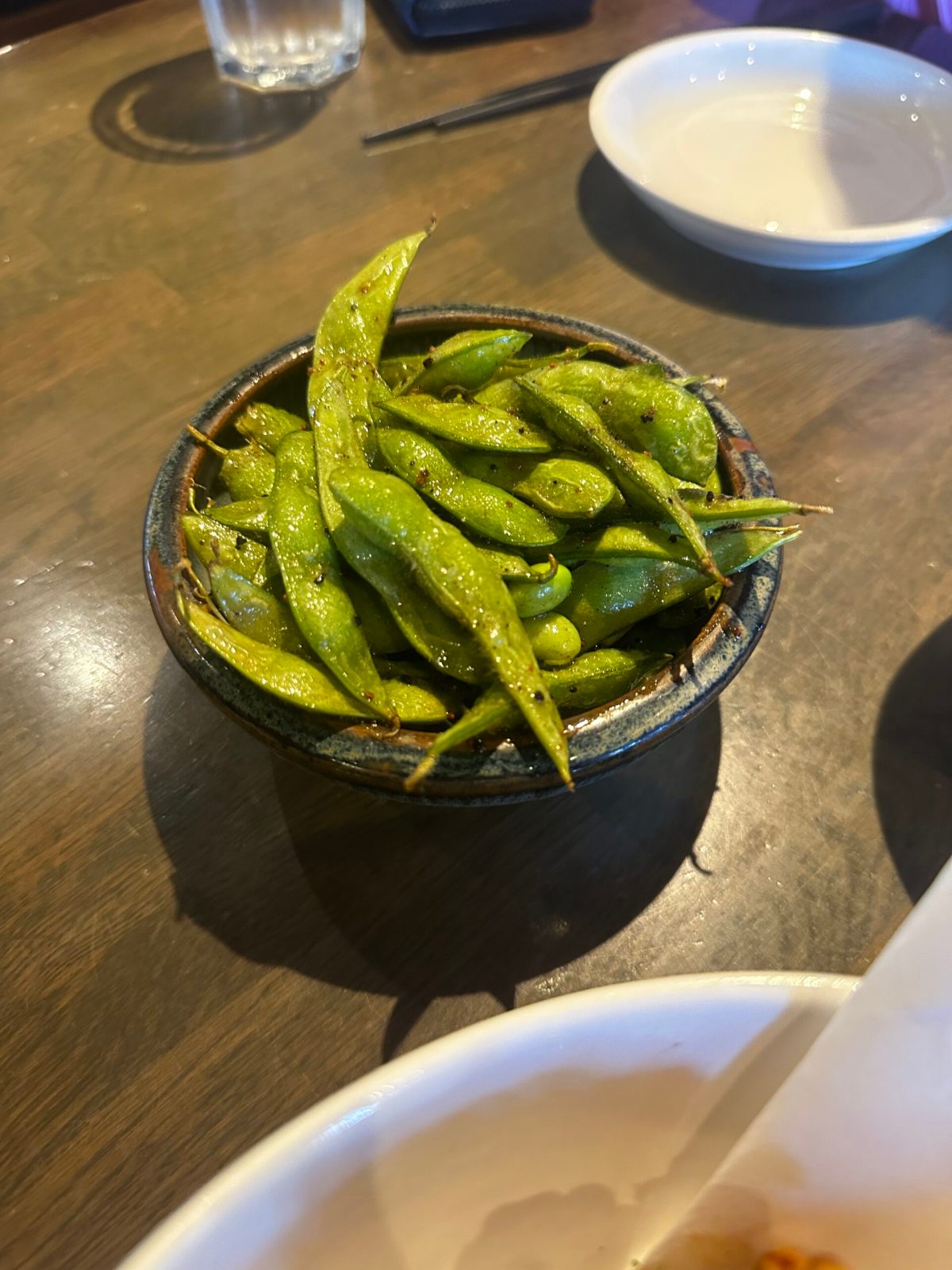 Black Garlic Edamame deep fried and tossed with sansho powder and black garlic oil. A classic Japanese staple, and one that you order for its texture. All the flavour is located on the bean’s exterior, that you don’t eat. So the easiest way to enjoy them is to put the whole thing in your mouth and engage in the necessary act of splitting pea pods with your teeth and tongue, in order to squish the peas out of them to eat. With that you get salty, soy, and pepper coupled with a smoky char.