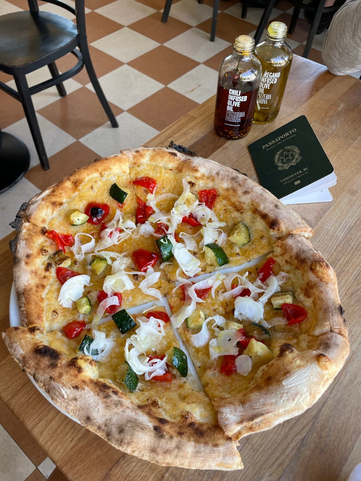 Cipolla Pizza (onion & Calabrian chili sauce, zucchini, sweet peppers, pickled fennel)