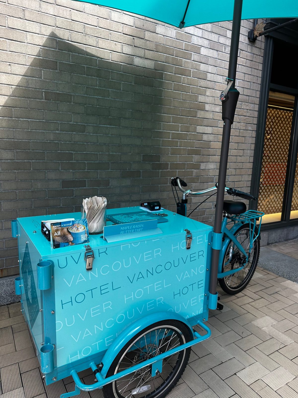 Already pre-packaged in single scoops, kept cool in the body of the cart. The packaging showcases the hotel chain’s logo in the cart’s matching teal.