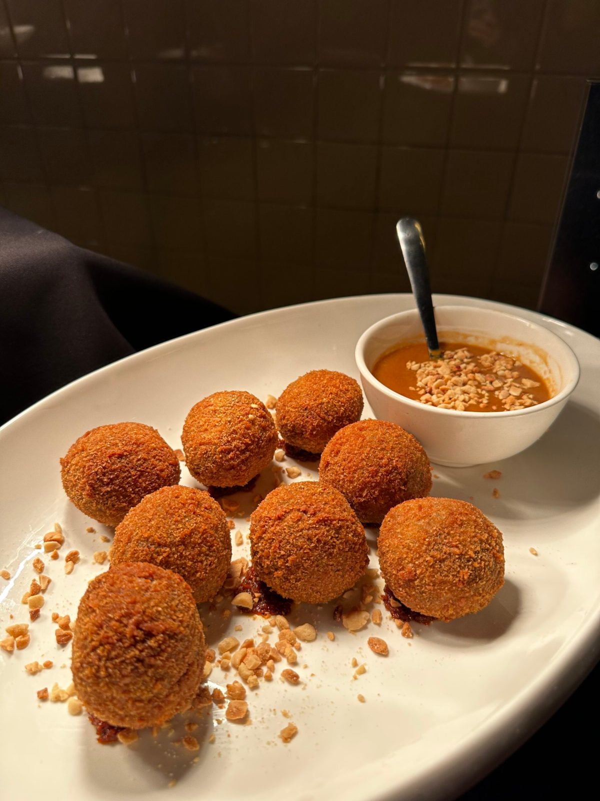 This family style menu included Tongue & Cheek “kare kare” croquette. Braised Snake River Farms wagyu beef cheek and tongue, shredded taro root, fermented shrimp satay, and sunflower sprouts. Each ball was thick and dense, you tasted the quality of the meat used, and could tell this was a very refined take. Although there was plenty of sauce on the side to self serve, I wish there was more peanut butter and cream in it. I wanted something more similar to what I know my favourite Filipino dish to be, and that also includes more fermented shrimp paste, as is customary.
