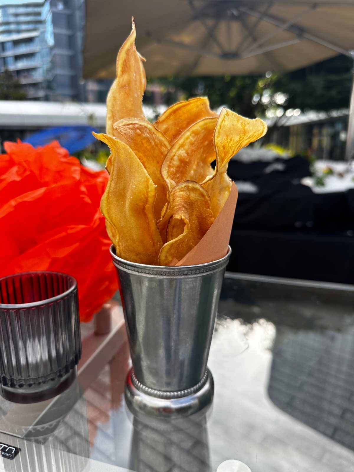 For food, small bites were brought around. This started with deep-fried yam chips, sliced vertically for quite the lengthly presentation. Eaten as is for a crispy chip-like crunch, but it could have used a dip.