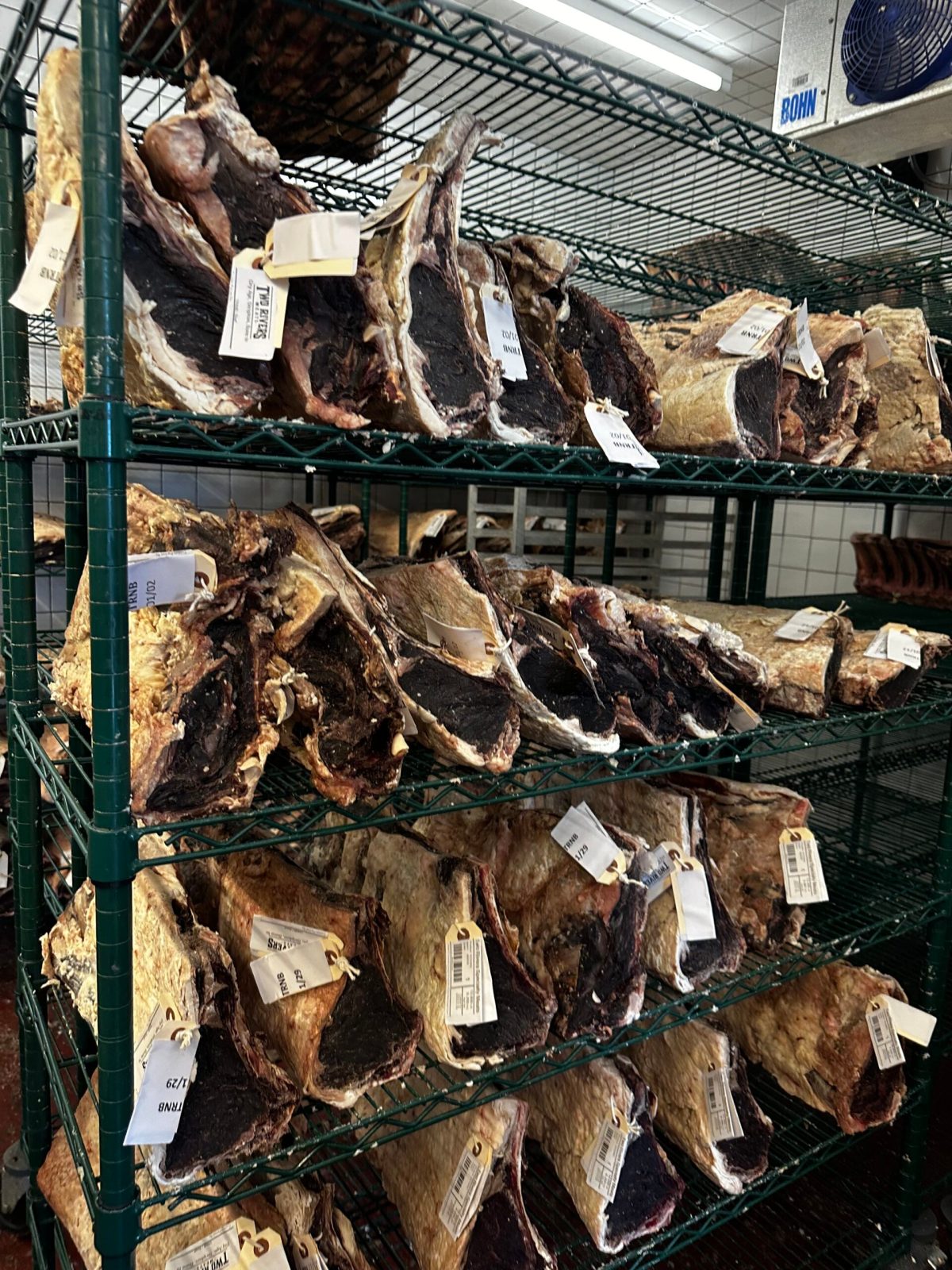 To walk off our meal we then took a tour of the place, starting with their dry aged cooler. A room full of metro racks carrying heavy slabs of meat, with many more hung on hooks, set at a slightly chilled temperature. These sit and dry for up to 45 to 65 days in what they call a controlled decomp. The result is meat that is more tender and more flavourful. Given the amount they sell through, this selection rotates out fast.