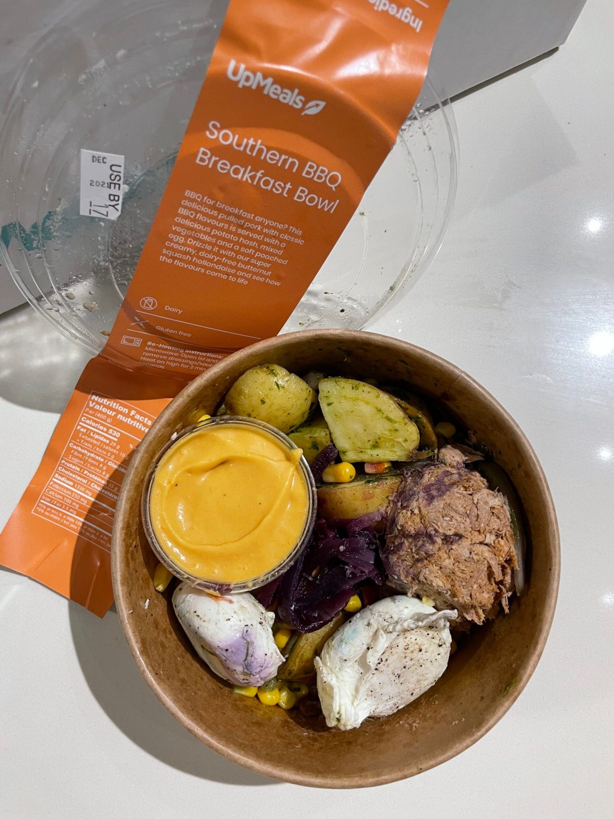 Day 1 started with the Southern bbq breakfast bowl featuring pulled pork in a classic hickory bbq sauce. It is served with a potato hash and mixed vegetables including corn, red peppers, onion, and pickled cabbage. The lot of it is topped with two perfectly poached eggs. As my first taste of Up Meals I was fully impressed. Both the presentation and the flavour of the dish held up. After a quick spin in the microwave I couldn’t tell that it was made before hand if no one had told me. There was so much flavour to this and it was deliciously satisfying as my first meal of the day. The highlight was definitely the creamy, dairy free, butternut squash hollandaise sauce that tied it to breakfast.