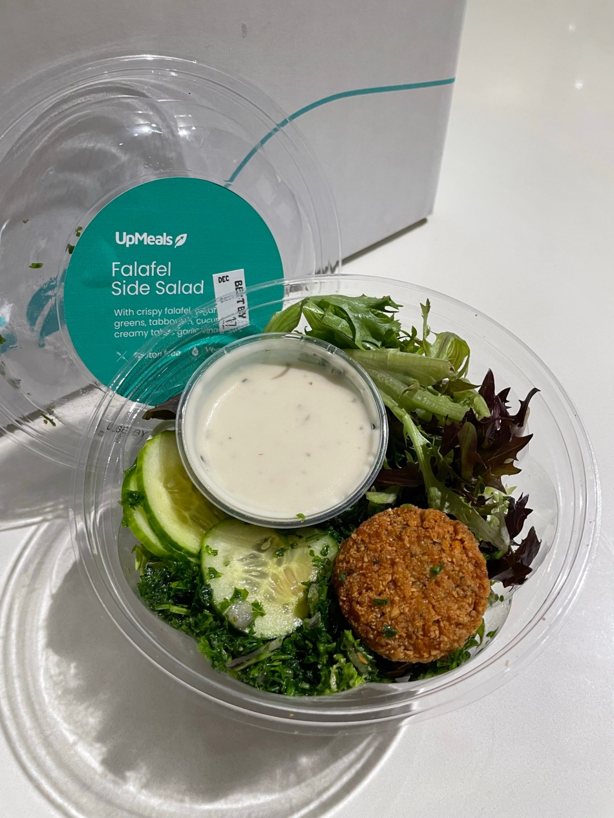 Looking for more greens, this meal also comes with a Falafel side salad of organic greens and tahini garlic dressing. It was the perfect mild accompaniment to the zesty tomato based wrap above.