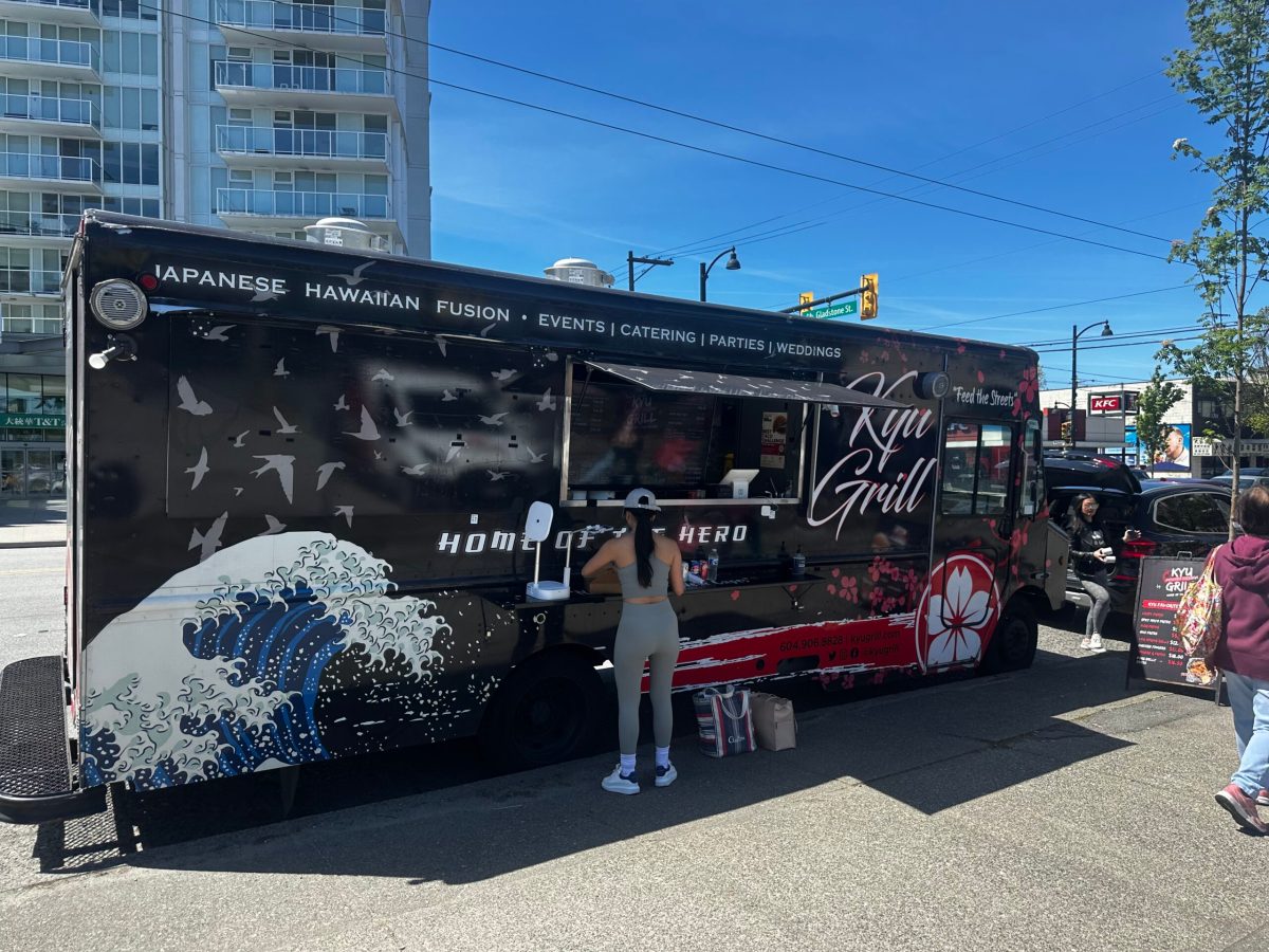 Kyu Grill is known for their Japanese-Hawaiian fusion food truck. An all black kitchen on wheel with blue frothy waves and gentle cherry blossoms painted on.
