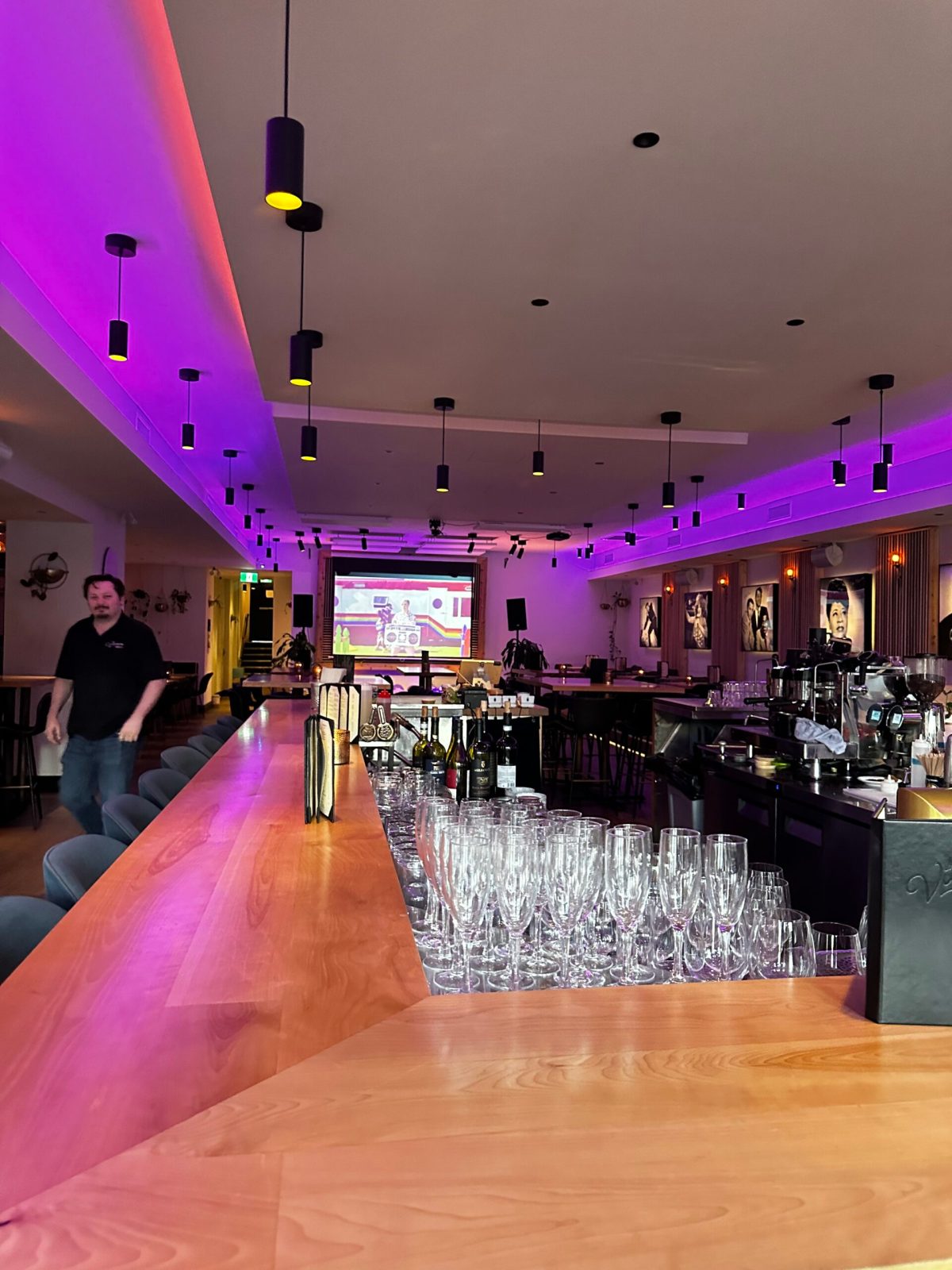 Already known for their live, local music nights, a Taylor Swift Dance Party doesn’t seem too out of their wheelhouse. Their backstage was littered with purple and yellow balloons and the projector was broadcasting Taylor Shift’s music videos, while playing the corresponding songs overhead. A DJ was at the ready should the crowd be present and wanted to dance to her hits. Sadly this did not happen from 7-9pm, and the event was advertised running until 10pm.
