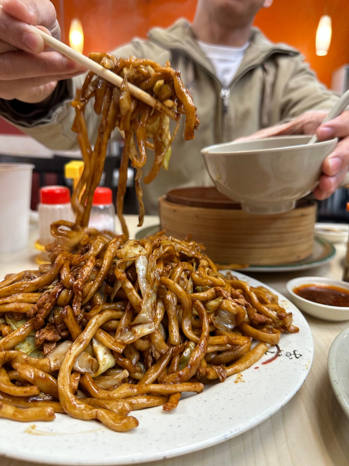 And ironically as a palate cleanser we order the Shanghai style pan-fried thick noodles with shredded cabbage and bits of chicken meat. Both of the latter are hardly noticeable, as you tend to order this dish for the texture of the thick cut noodles. In fact, I avoid the cabbage all together due to my dislike of the texture of leafy greens, so enjoy the light sweet soy flavoured noodles for their starchy chew.