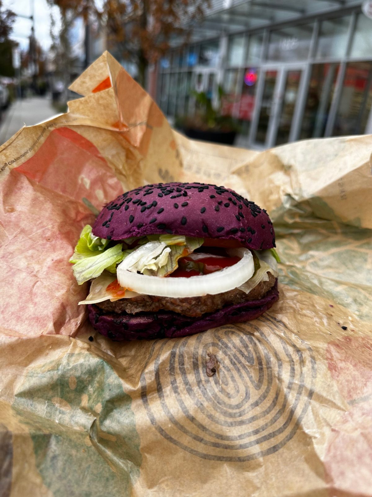 I digress. All the above is sandwiched between a warm toasted sesame seed bun. And the one for this limited edition release is a Royal purple with black sesame seeds. I appreciated the colour choice as opposed to the black, which has already been done. Plus it felt more like teenage girl with colour scheme. The dye job did not affect the fluffy texture of the burger. It was exactly as expected, equally parts crispy to soggy with vegetables versus thin patty and spongy bun.