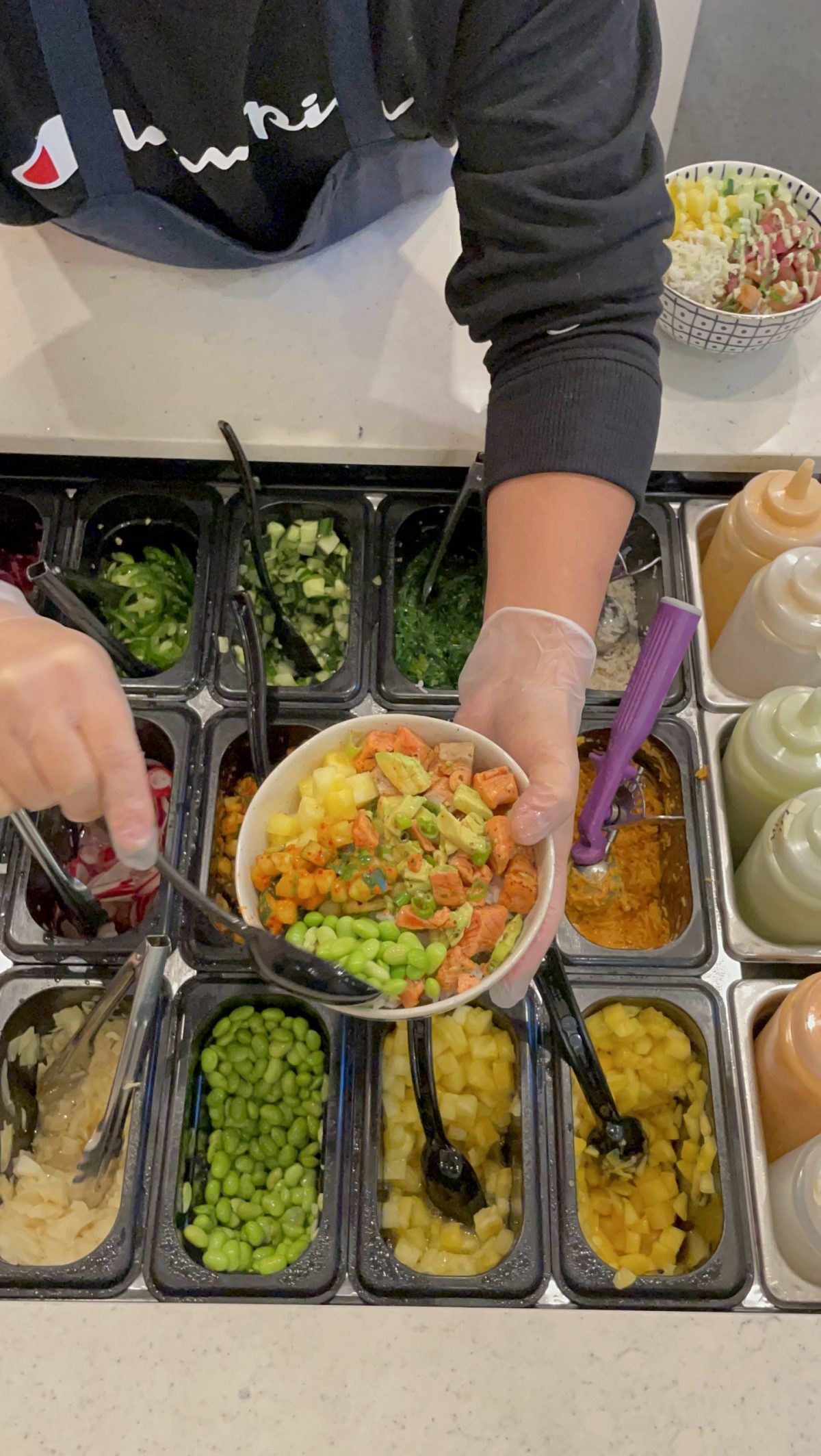 And the fun part, you can to see it each bowl built before your very eyes starting with either white or brown rice, or a salad as your base. To that your chosen protein is weighed for an even distribution. Choose from 2 types of tuna, 2 types of salmon, or prawn. For those who don’t like seafood there is a chicken option, and tofu is for the vegans. You can go so far as to even choose the flavouring agent for your protein. Sauces and oils to add salt or chilli. Next comes your toppings: pickled or fresh vegetables, sweet fruit or seaweed and crab salads. After, comes your choice of sauce to drizzle over everything. Soy, garlic, coconut curry, ponzu, or sriracha based to name a few. And the final touch is a collection of crispy elements that gets added on like sprinkles. Fried onion or garlic, chopped seaweed, sesame seeds, tempura bits, masago, pea shoots; or even all of the above.