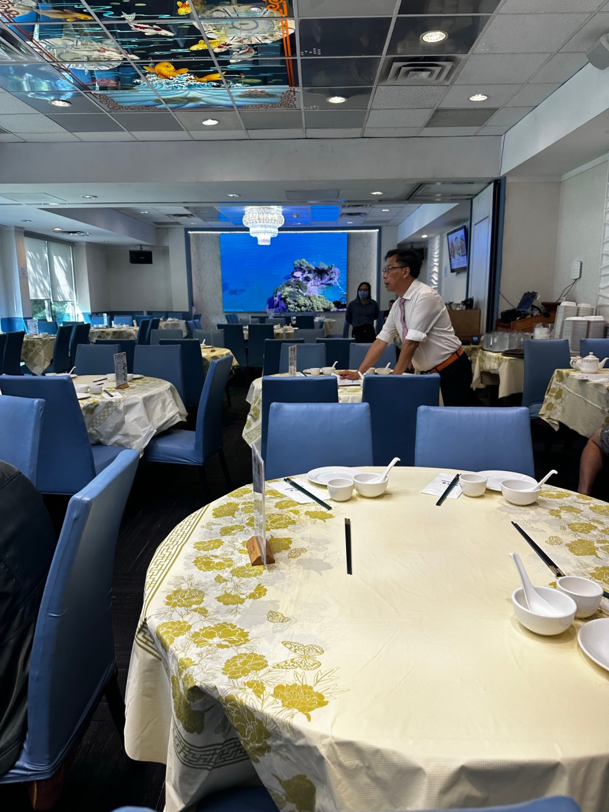 The restaurant is unsuspectingly large for an outdoor plaza business. We were ushered past the front foyer fish tank, right into the second annex room. The mirrored ceiling art caught my attention: koi fish swimming in a pond.