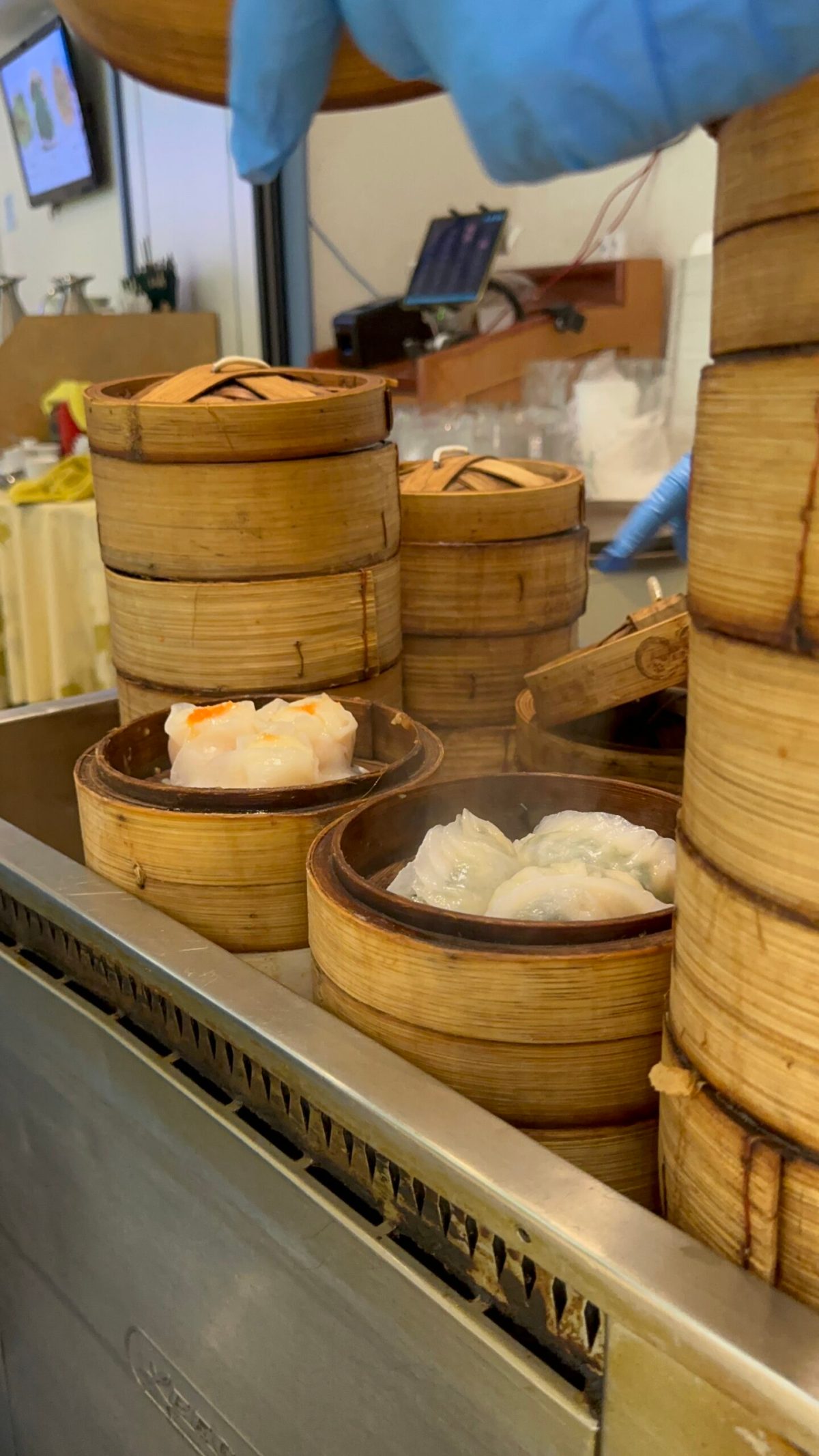 The steamed cart had towers of bamboo steamers stacked one on top of the other, heated from the bottom A quick lift revealed the likes of chicken feet, vegetable dumplings speckled with green under “clear” wrappers, and ones with scallops topped with tobiko.