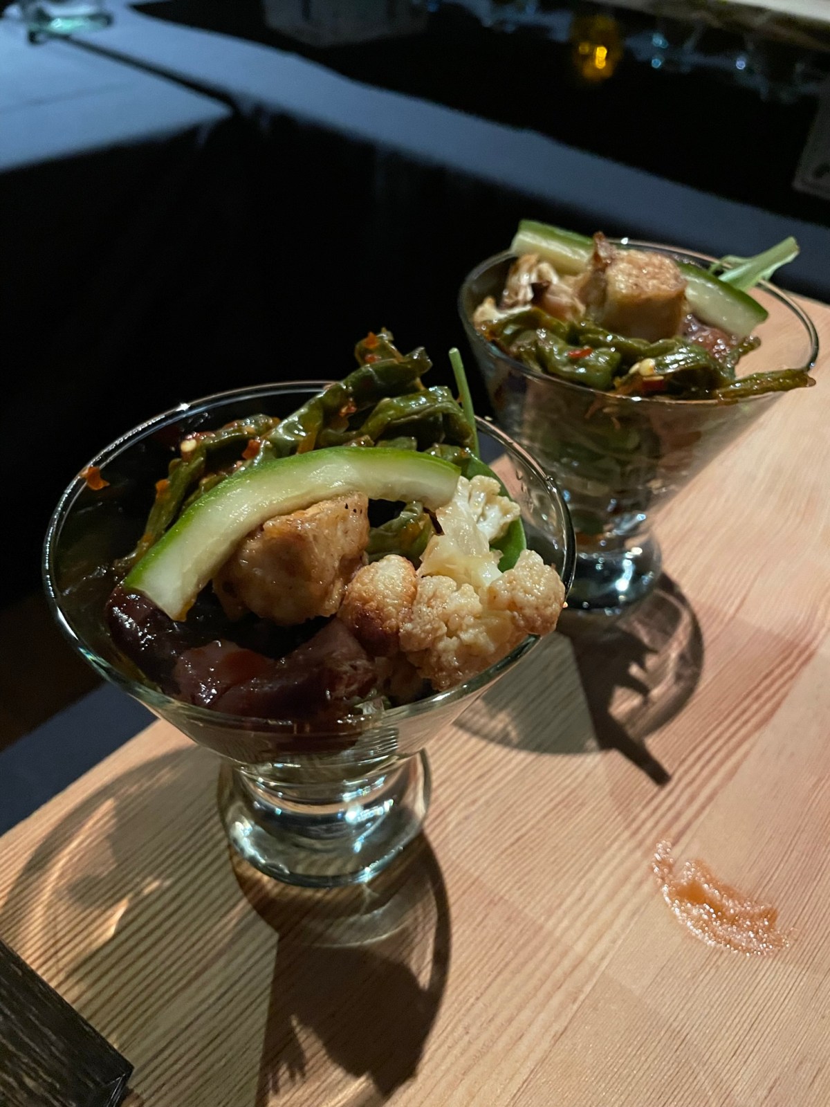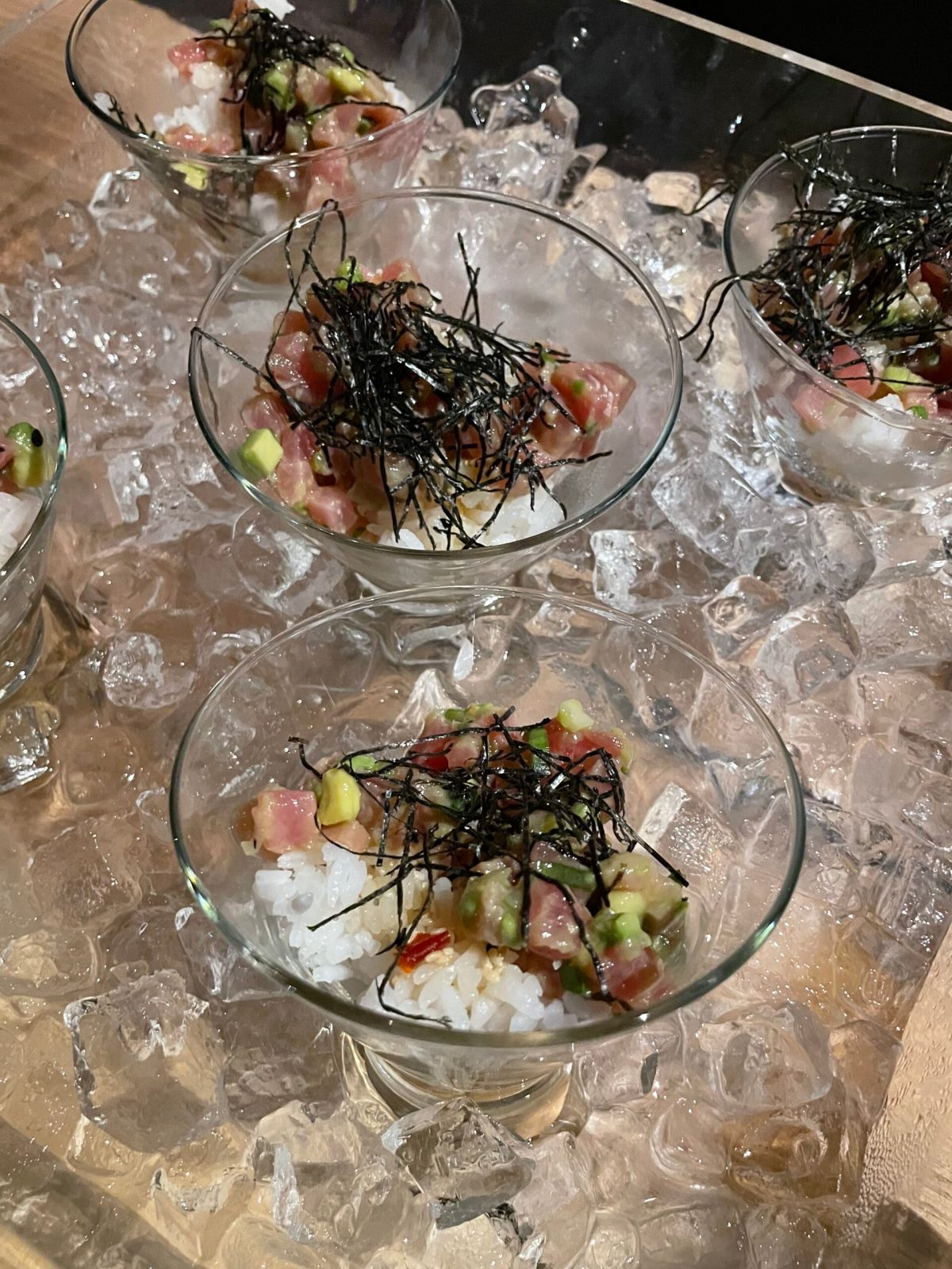 The food was catered by The Lazy Gourmet. A table of help yourself dishes served in cocktail glasses for easy portable dining on the move. It included Asian marinated vegetables and tuna poke over ice.