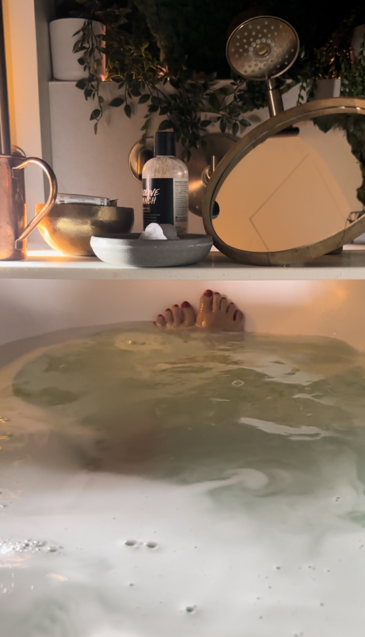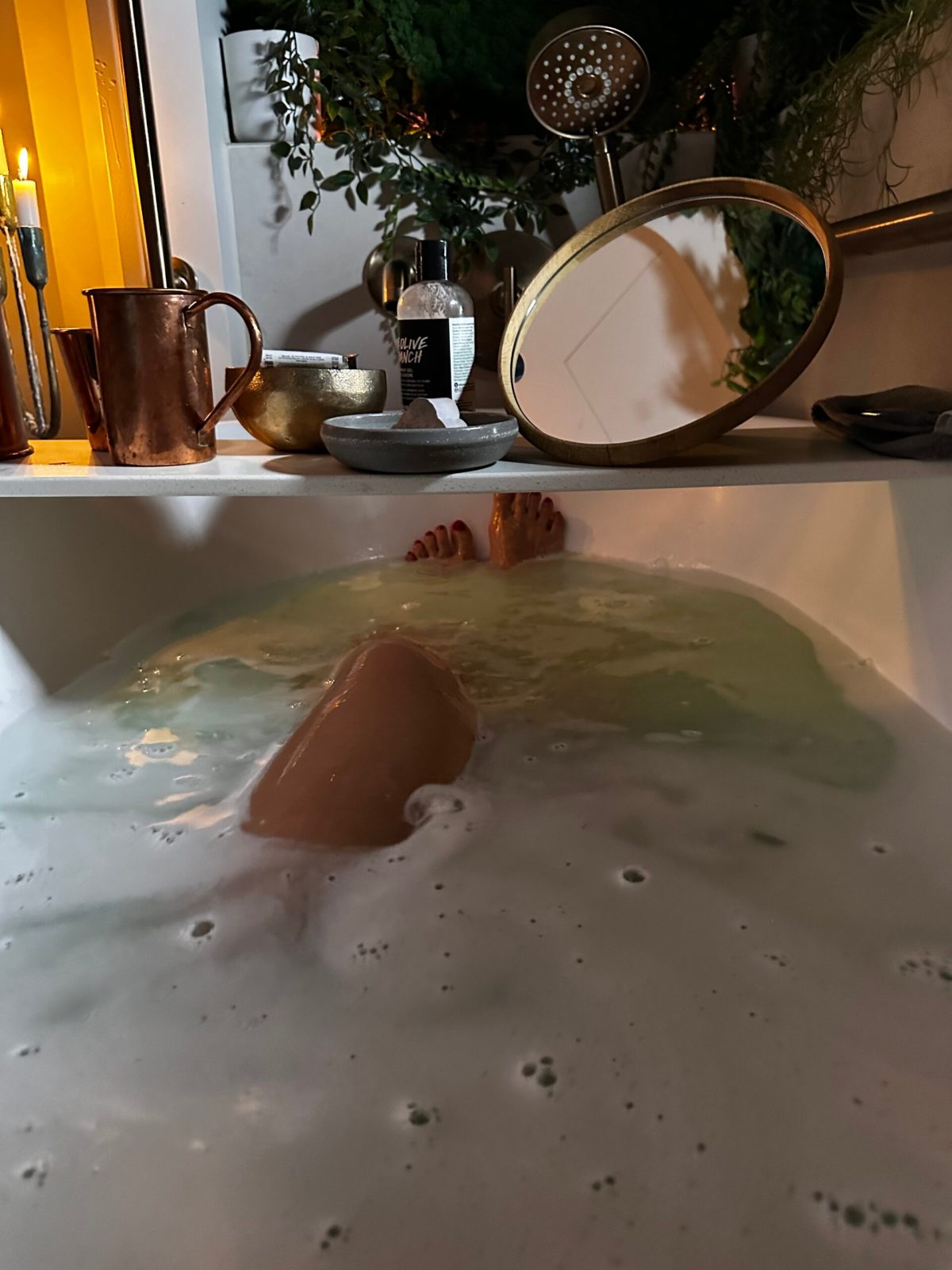 As I slid down into the deep of the tub, I lost myself into the murky waters. I unwinded and felt the tension release from my shoulders and the freedom of my limbs as I bobbed.
