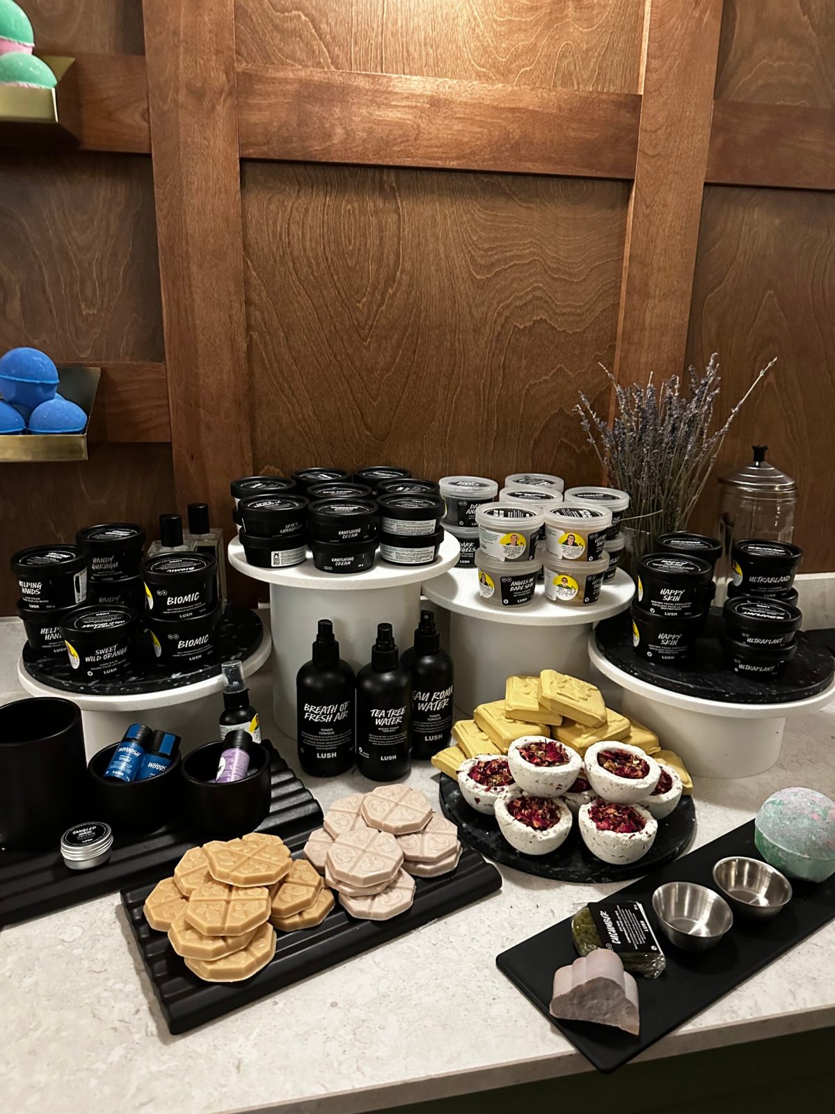 When time, a voice comes over head, inviting you to wrap up. From here you can take your time drying off and composing yourself at their in-suite vanity. A mirror, hair accessories, body lotion, and fragrances from their Lush body collection.
